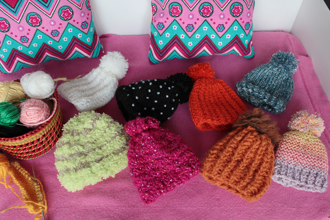 čepice, včetně té maličkaté pro Polly Pocket (pleteno z vyšívací bavlky na jehlicích 1 mm), ta pak dostala i