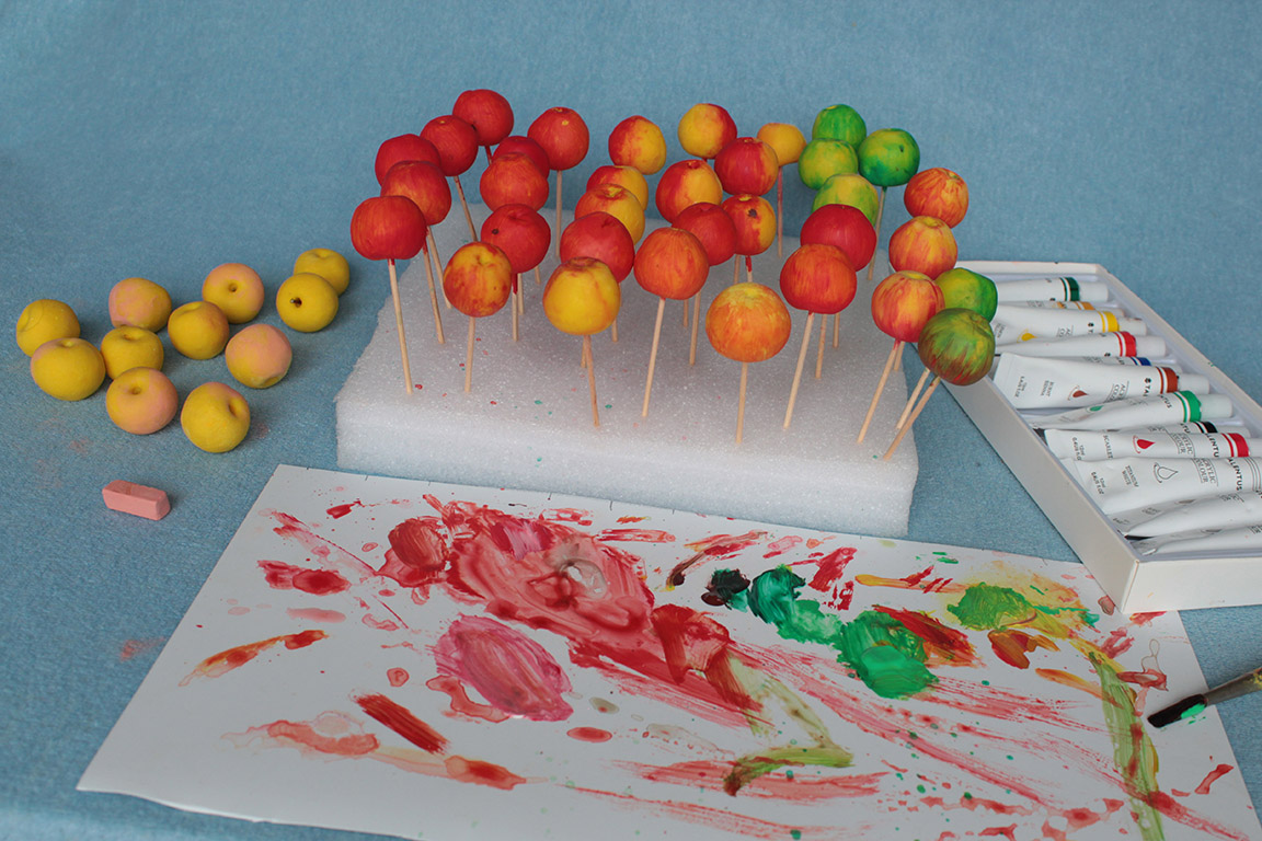 nastříhám na vhodné velikosti a do každého jablka vlepím dřevěnou