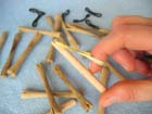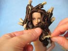 Na natáčení vlasů používám u Tonnerek staré dřevěné natáčky na trvalou. Jsou uprostřed ztenčené a na obou koncích mají zářez. Je mi ovšem jasné, že tyhle natáčky nemá doma každý, a tak jsem udělala na zkoušku alespoň dvě natáčky z obyčejné dřevěné špejle o průměru 6mm (lepší by byla tenčí, jenže já doma jinou nenašla). Zářezy jsem udělala jemnou pilkou a navlékla jsem do nich tenké gumičky nastříhané z prstů vyřazených gumových rukavic, které běžně používám v domácnosti. Při namotávání jednotlivých pramenů na natáčky si pomáhám krepovou lepící páskou. Ustřiženým kouskem přilepím vlasy hned u špiček ke kraji natáčky, šikmo natočím pramen dostatečně vysoko a zajistím gumičkou. Na Barunčin účes jsem použila 20 natáček a myslím, že je to odpovídající množství, i když tady platí, že čím více, tím lépe. Když mám panenku kompletně připravenou, naliji potřebné množství vařící vody do umyvadla a ponořím do ní natočené vlasy tak na 15-20 vteřin. Hned potom následuje koupel vlasů ve studené vodě s trochou aviváže.Když to máme za sebou, jemně osuším natočené vlasy ručníkem a nechám je proschnout do druhého dne. |