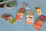Výroba sáčků je nejjednodušší. Všechny vystřihněte bez přídavků, přehněte v polovině, znovu rozložte a tenkým štětečkem naneste na rub papíru po celé délce levého i pravého okraje lepidlo tak, aby po opětovném přeložení vzniknul malý sáček. Pevně přitiskněte a potom ještě hrany přejeďte tupou stranou nůžek nebo nože. Já jsem nakonec všechny pytlíčky naplnila jemným pískem, to jen pro větší iluzi skutečnosti, a teprve pak jsem zalepila horní krátkou stranu.