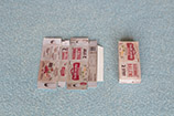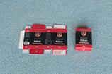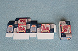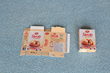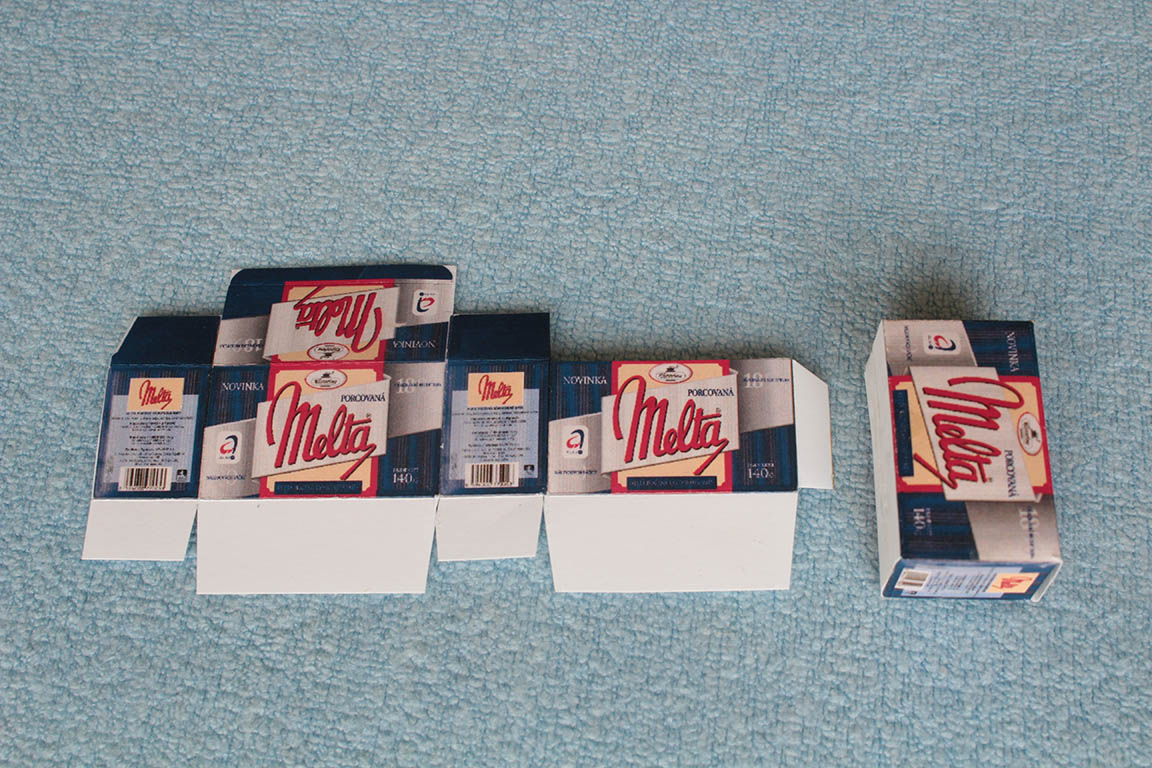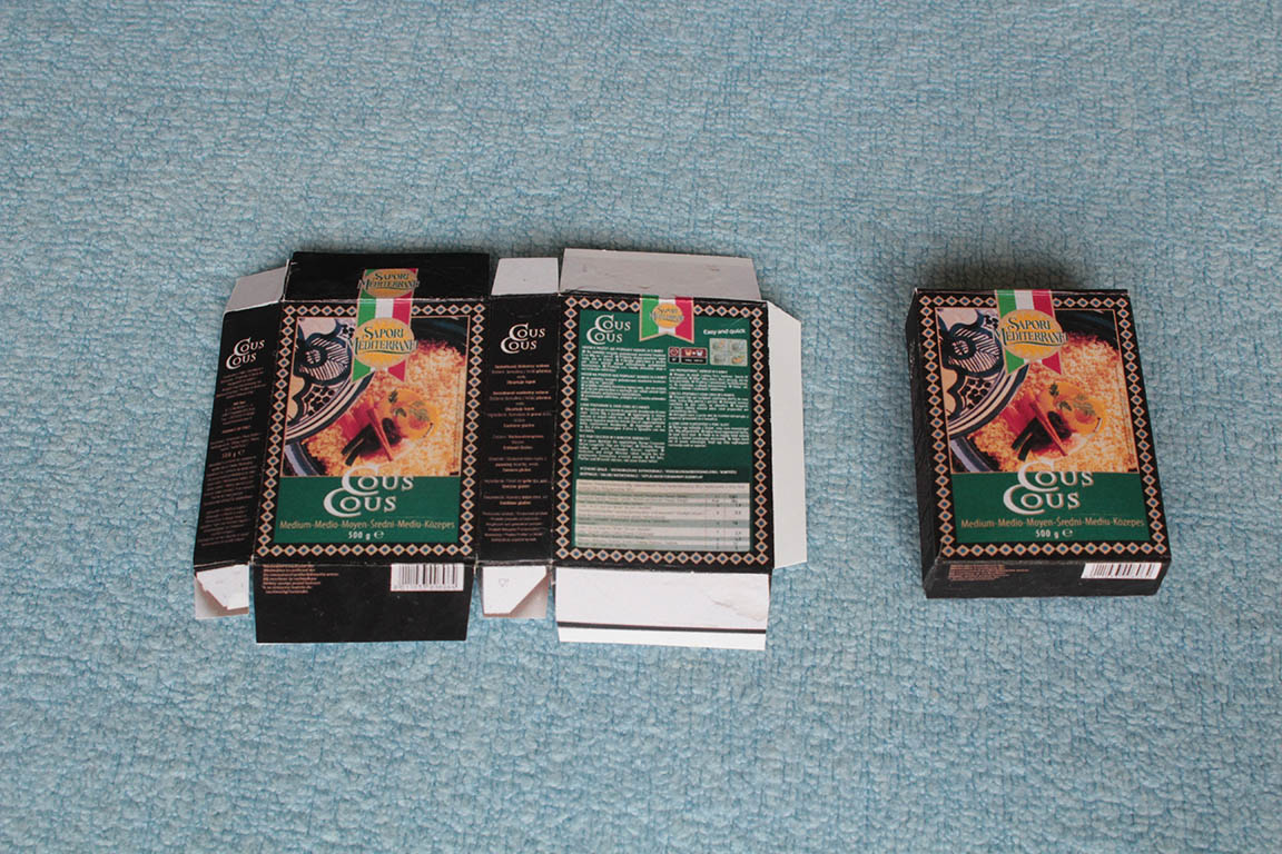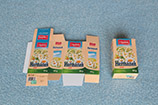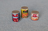 Krabicové mléko je na rozdíl od ostatních krabiček trochu zapeklitější...tedy, pokud ho chcete poskládat tak, jako je tomu u toho reálného. Je třeba mít nějaký pevnější základ, nejlépe dřevěný špalík. Vytištěný obal vystřihneme i s přídavky podle prvního obrázku. Narýhujeme si hrany, ta horní je vedená v úhlopříčkách dvou bílých čtverců, a ještě si zalomíme i bílý proužek na samém vrcholu. Do připraveného obalu vlepíme špalík, ale jen jeho boky, přední a zadní část. Pak natřeme vršek špalíku, přitiskneme na dřívko horní část obalu z obou stran s tím, že bílý pruh slepíme proti sobě po celé délce. Po zaschnutí ho nůžkami zkrátíme, složíme ho k jedné straně, ohneme oba rohy a přilepíme je na boky. Spodek mléka skládáme jako běžnou krabičku, tedy pomocí nastřižených hran....řekla bych, že nejjednodušší je podívat se na běžné krabicové mléko z obchodu. Výroba konzerv není nijak složitá, obaly