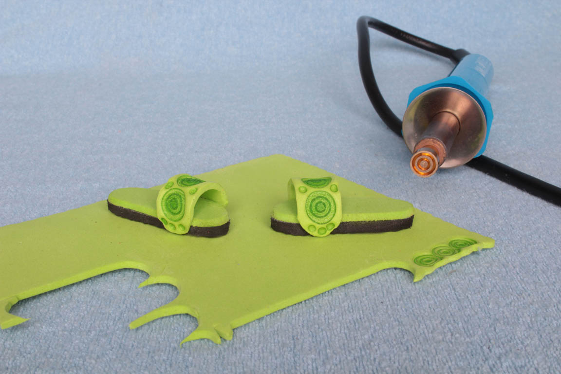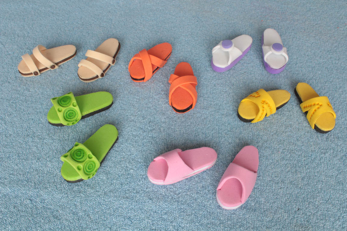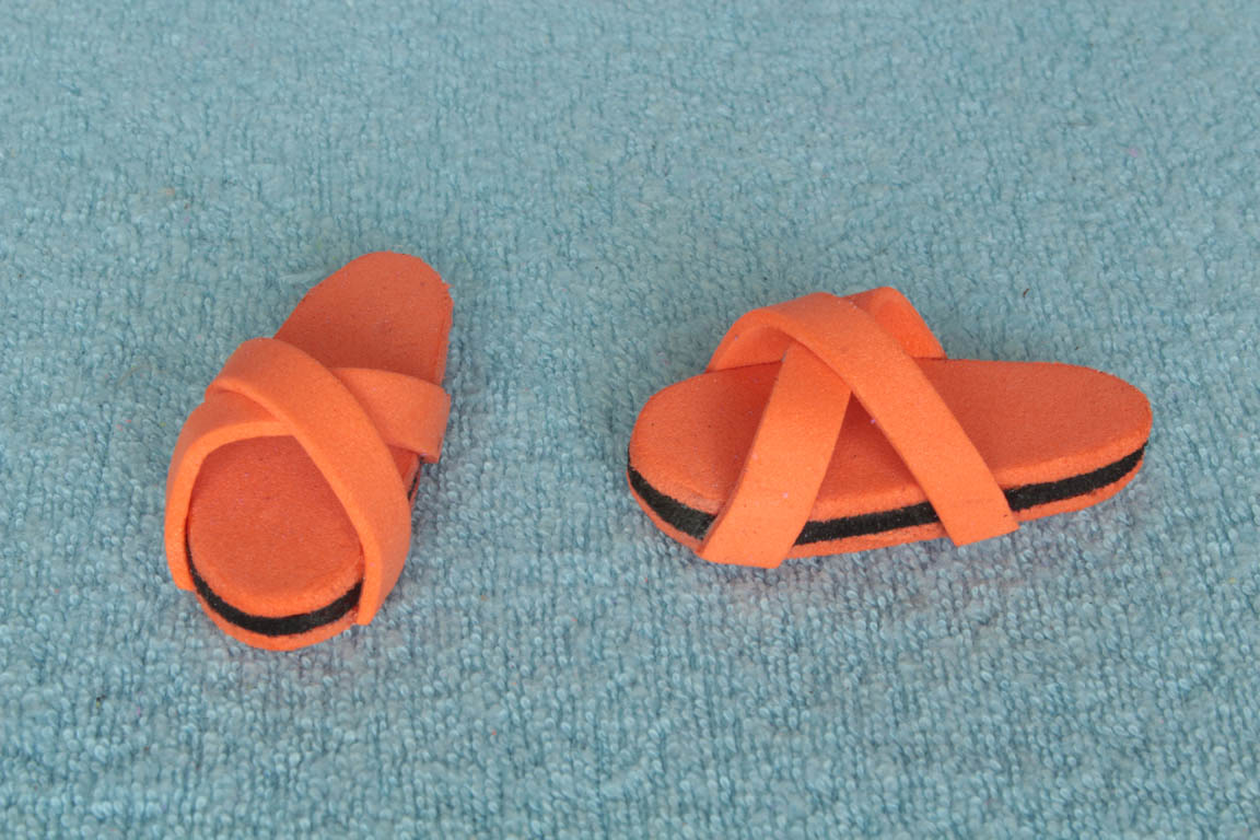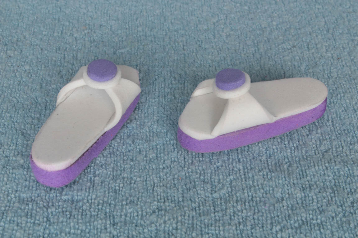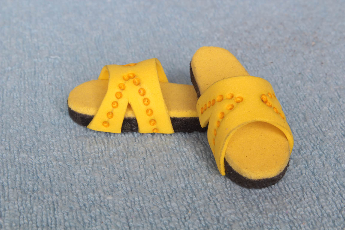 Získala jsem tak pěnovku v různých tloušťkách a barvách. Na další pantofle jsem využila černou pěnovku, původně sloužící jako protiskluzové podložky, která je na jedné straně samolepící na druhé strukturovaná. Dobře imituje podrážku, je silnější a tak už na ni stačí nalepit jen jednu vrstvu tentokrát tenčí moosgummi - já použila žlutou. Svršek jsem ozdobila vypalovačkou. A vyzkoušela jsem ji i na zelených pantoflích, to jsem ale vyměnila hrot a vypálila ozdobná kolečka. Oranžové pantofle nepotřebují žádný komentář. Bílofialové pantofle mají podrážku opět ze silnější