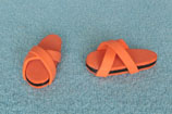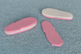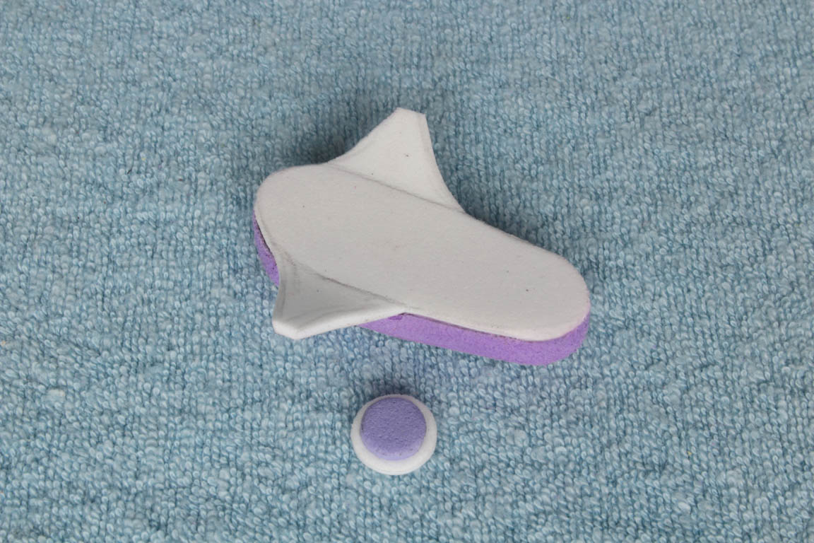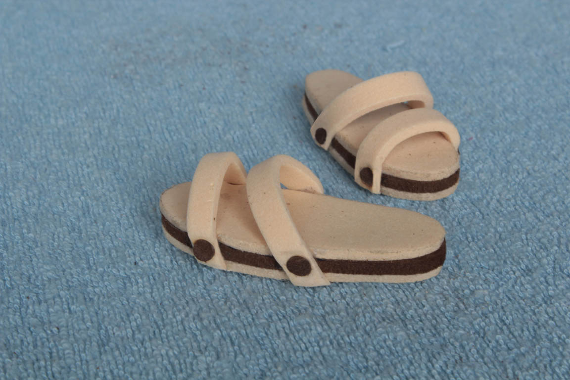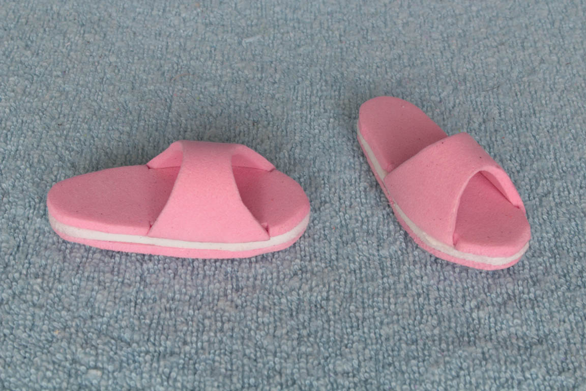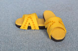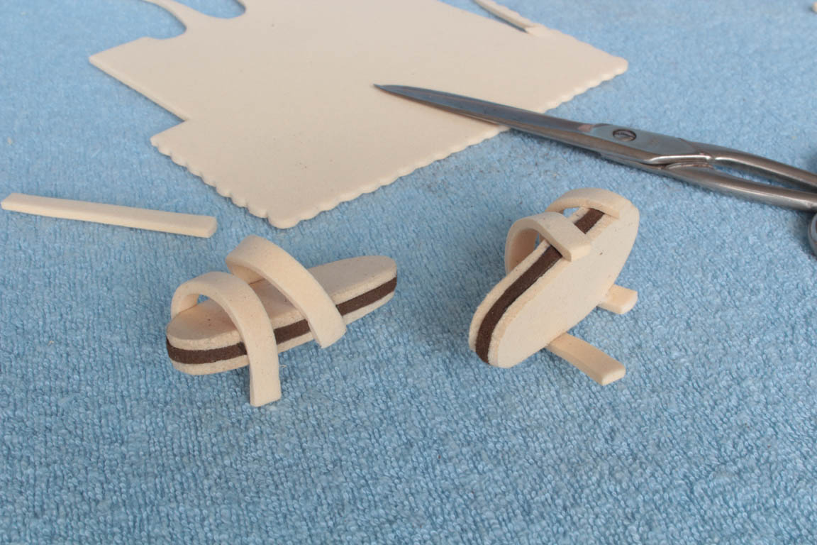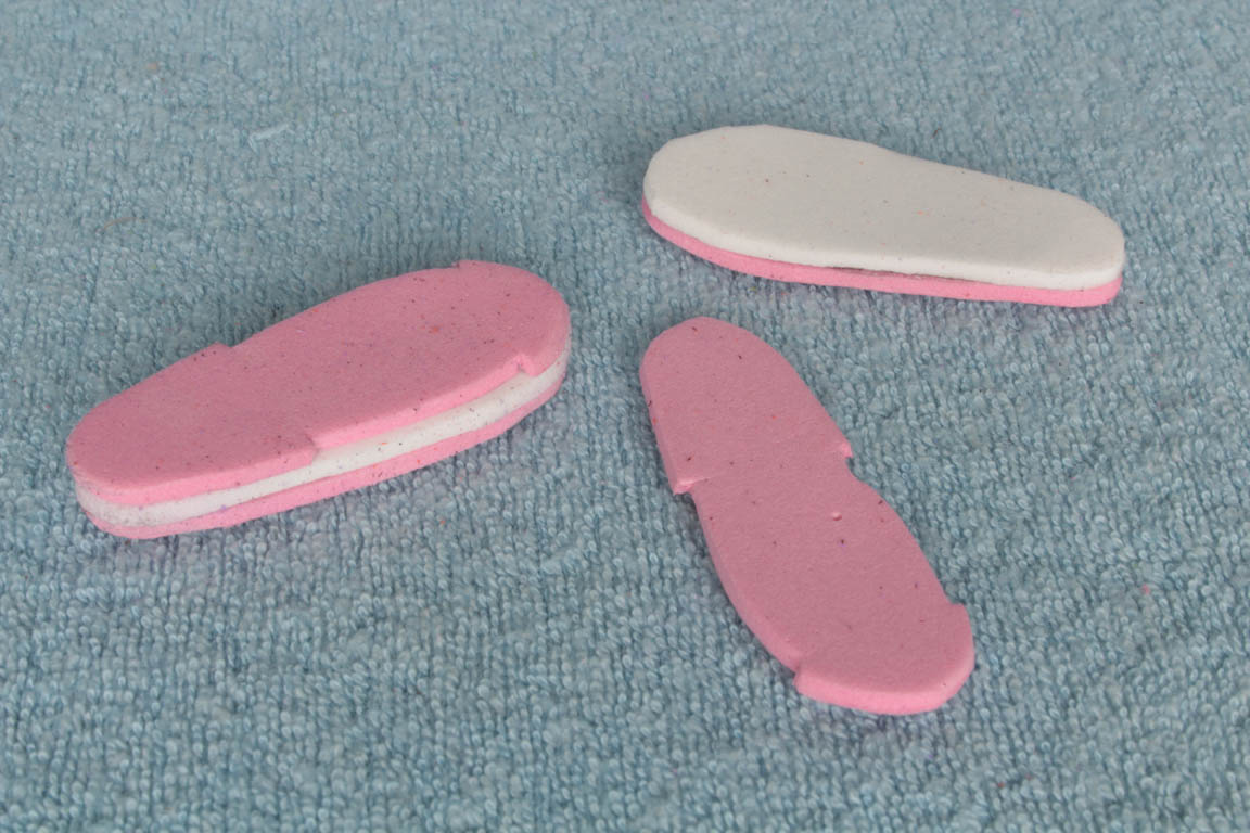 Získala jsem tak pěnovku v různých tloušťkách a barvách. Na další pantofle jsem využila černou pěnovku, původně sloužící jako protiskluzové podložky, která je na jedné straně samolepící na druhé strukturovaná. Dobře imituje podrážku, je silnější a tak už na ni stačí nalepit jen jednu vrstvu tentokrát tenčí moosgummi - já použila žlutou. Svršek jsem ozdobila vypalovačkou. A vyzkoušela jsem ji i na zelených pantoflích, to jsem ale vyměnila hrot a vypálila ozdobná kolečka. Oranžové pantofle nepotřebují žádný komentář. Bílofialové pantofle mají podrážku opět ze silnější