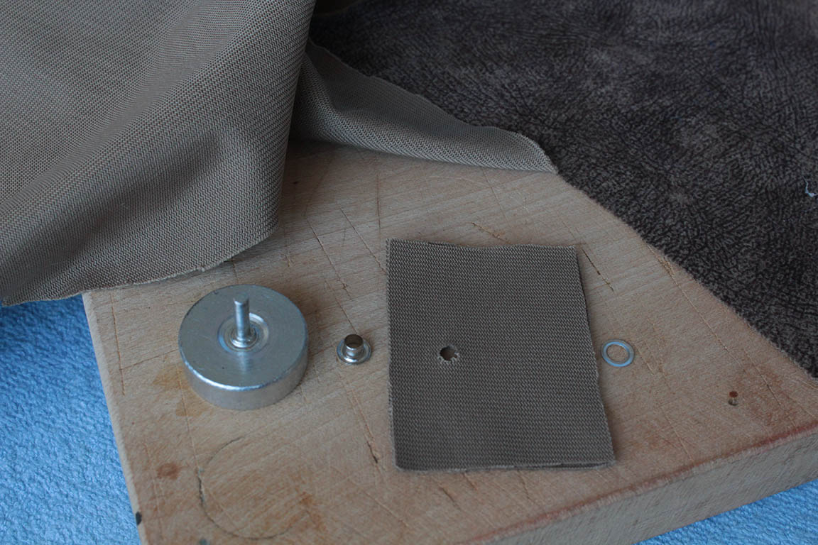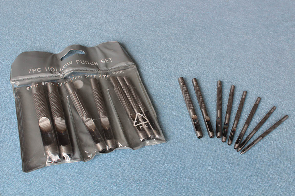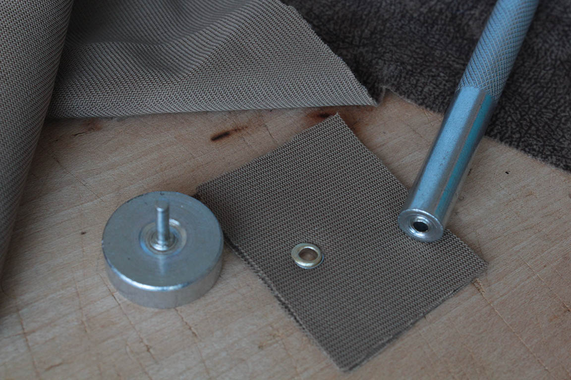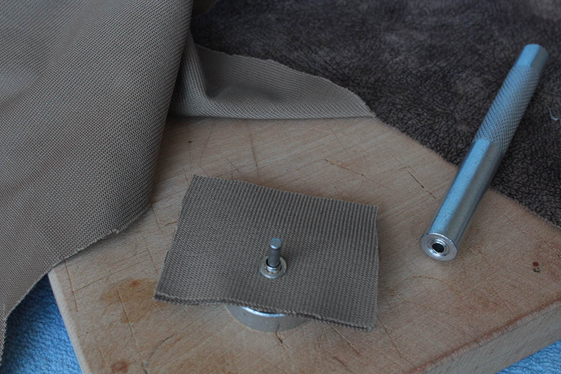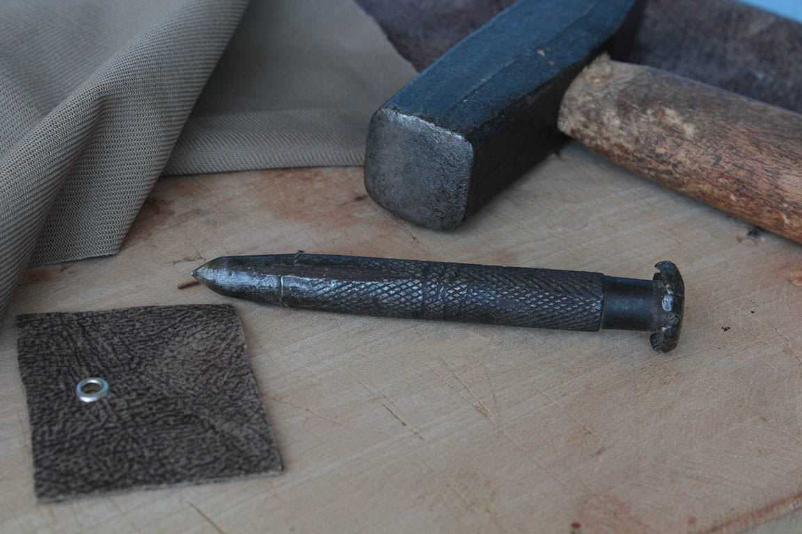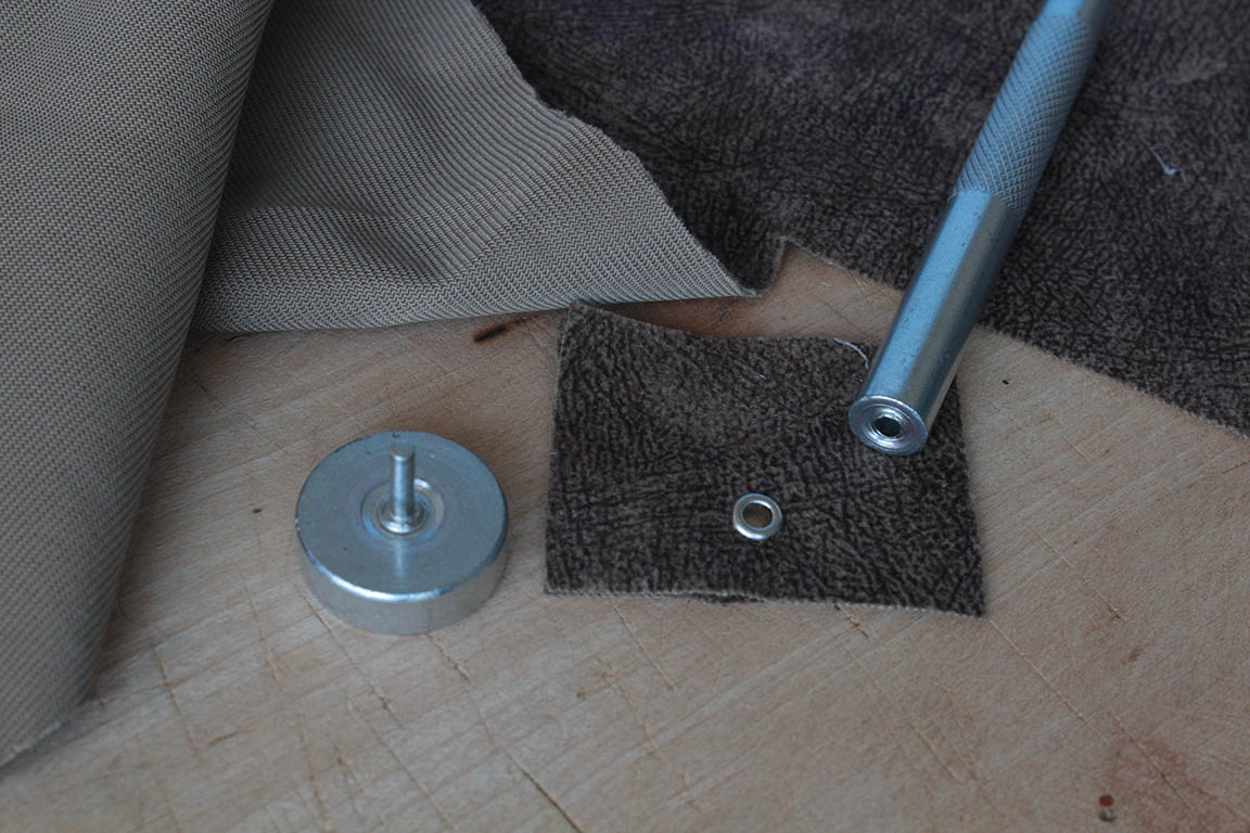Maličkaté průchodky a "udělátko" na jejich upevnění do látky jsem měla v plánu koupit už delší čas. Kovové kroužky by se mi hodily pro rychlé zpevnění otvorů na šněrování dobových šatů... a nejen tam. Nakupovala jsem na aliexpressu a vybrala tu nejmenší velikost kroužků s podložkou, to je 3mm vnitřní průměr. Zvolila jsem tři různé barevné varianty. Nejprve ale potřebujeme do látky udělat otvor, a i když jsem doma měla sadu výsečníků ve které je i průměr 3 mm, koupila jsem zároveň sadu výsečníků menších - to se může hodit. Takže nejprve vyseknu dírku, pak nasadím látku (dvojitě) rubem nahoru na spodní část kovového minilisu. Pak na trn navléknu ještě podložku a vše uzavřu horní částí lisu. A teď přijde ke slovu kladivo. Je třeba udělat pár pokusů, aby člověk přišel na to, jakou silou a kolikrát udeřit a taky je rozdíl v tvrdosti průchodek podle materiálu, ze kterého jsou vyrobeny.