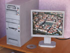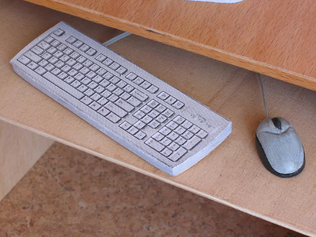 držáku na zrcátko.Počítač je z polystyrénu, klávesnice a monitor ze dřeva, vše