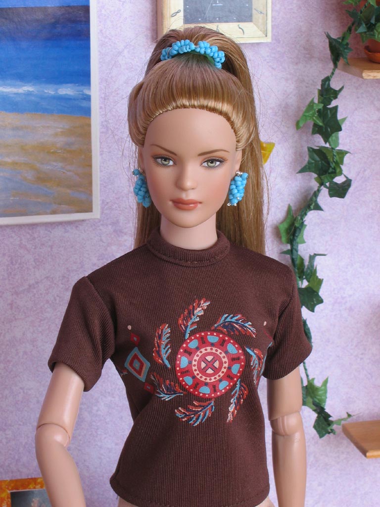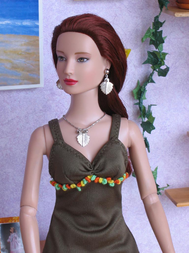 z plastu, přemalované béžovou barvou. Náušnice, náramek a spona ve vlasech