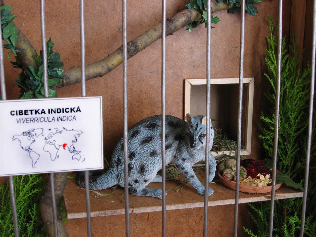 Klec pro cibetku je vyrobená ze sololitu a svářecího drátu.