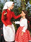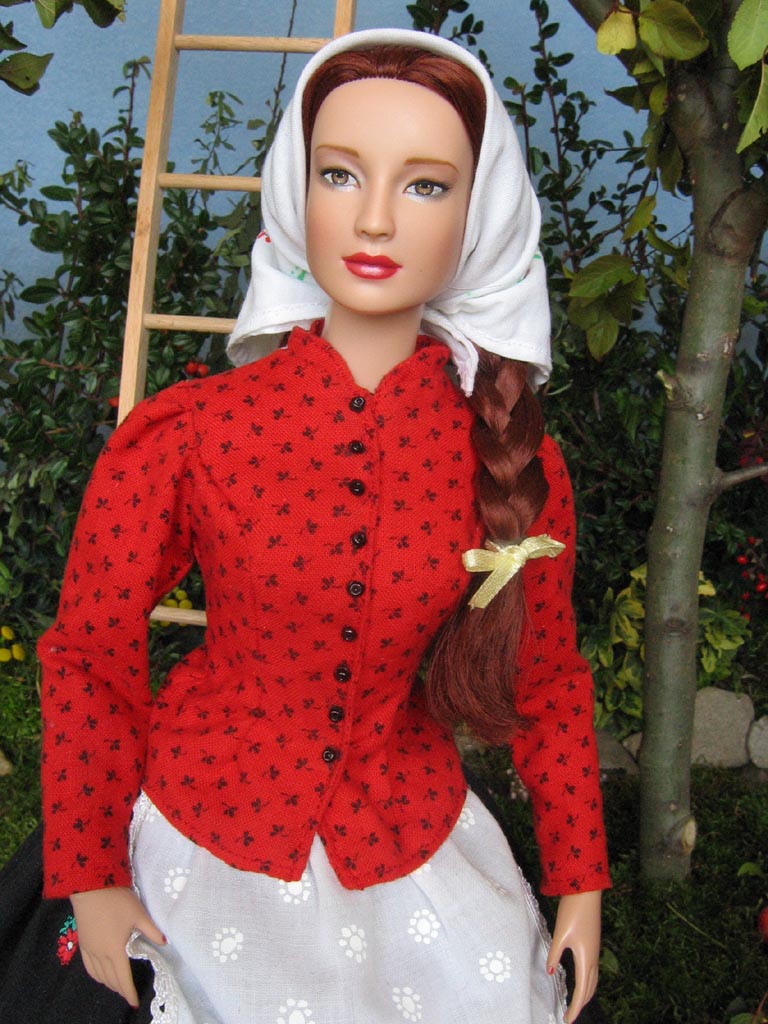 košilku zdobenou štykováním a přes ní oblíkla širokou nabíranou sukni vzadu na