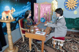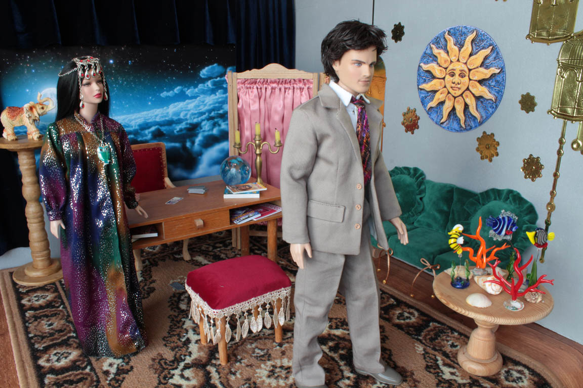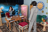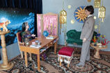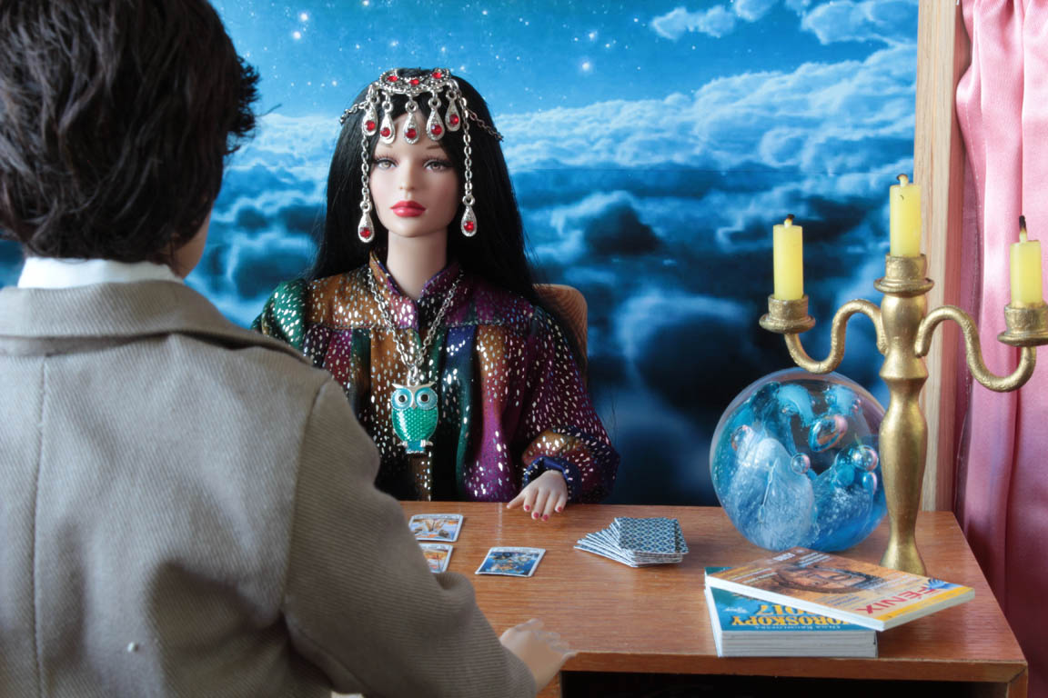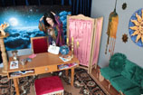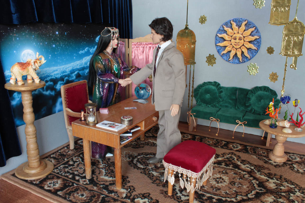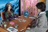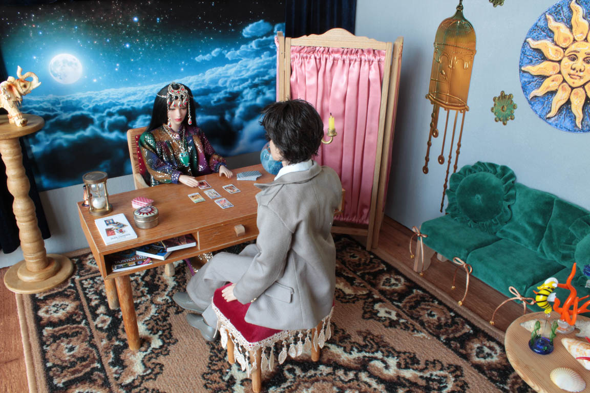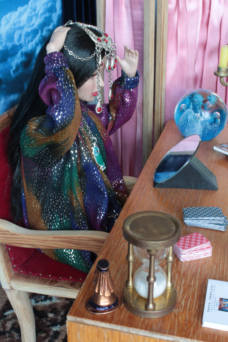 očím....tajuplná věštkyně si zrovna sundává černou paruku a odstrojená se chystá