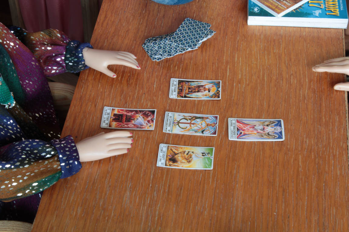 aby se posadil. Z vyložených tarotů vybírá Tomáš pět karet a Tea z nich čte, co