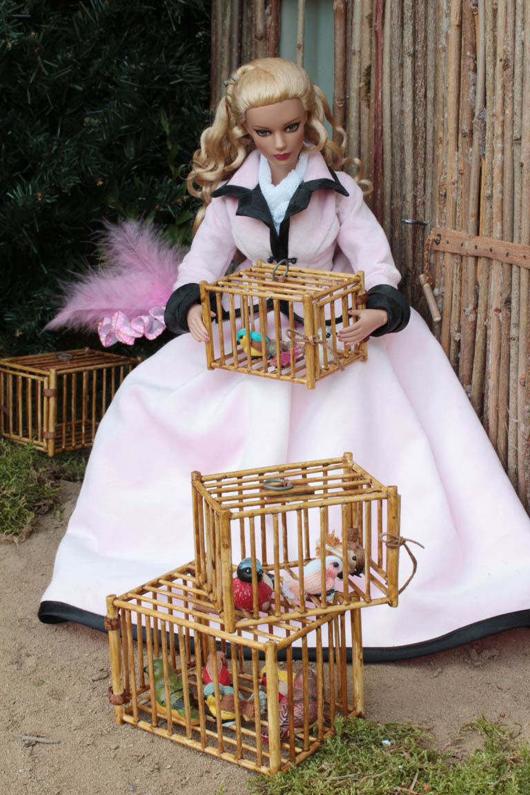 klece plné ptáčků. Se zájmem si je prohlíží... je jí však líto zavřených zpěváčků,