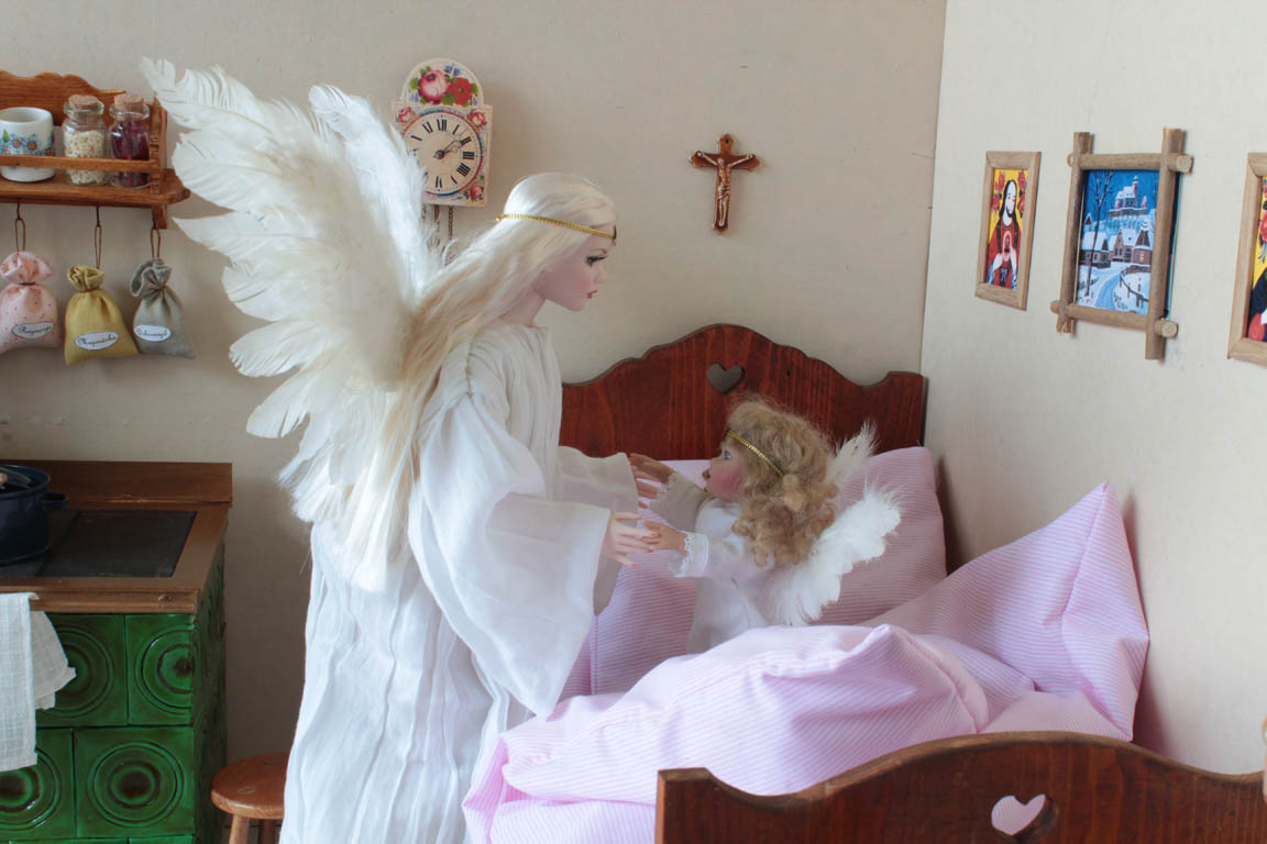 do postele, maminka už se trochu hněvá, protože je andílek málo oblečený a ona
