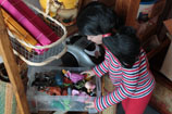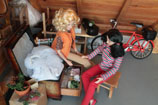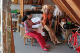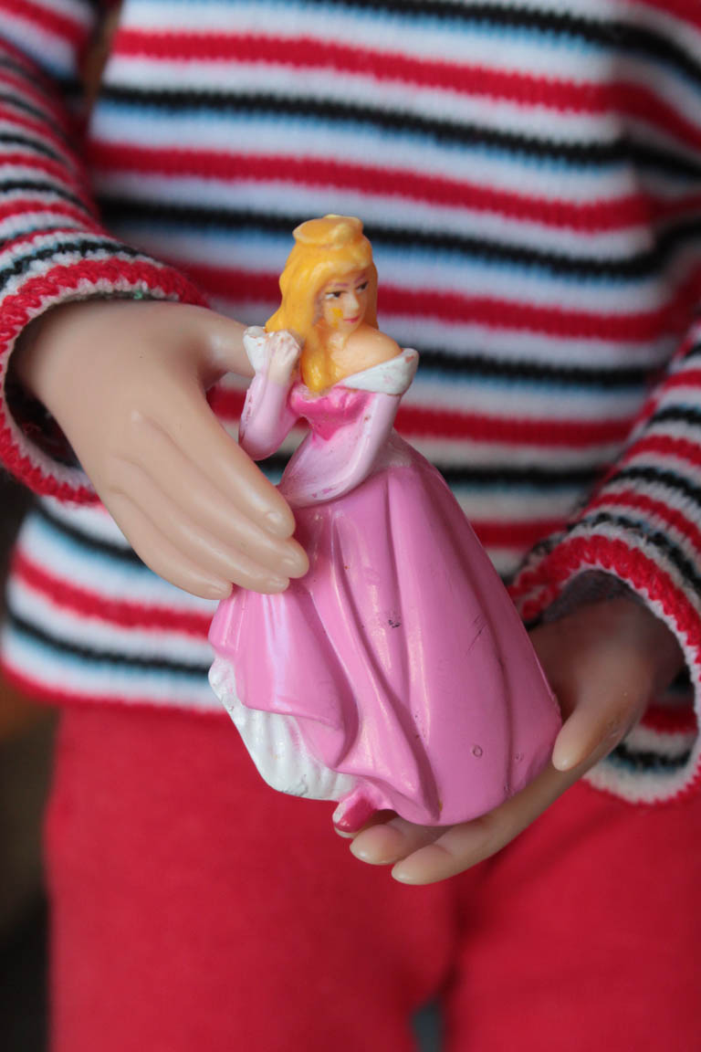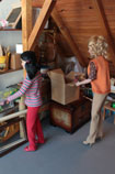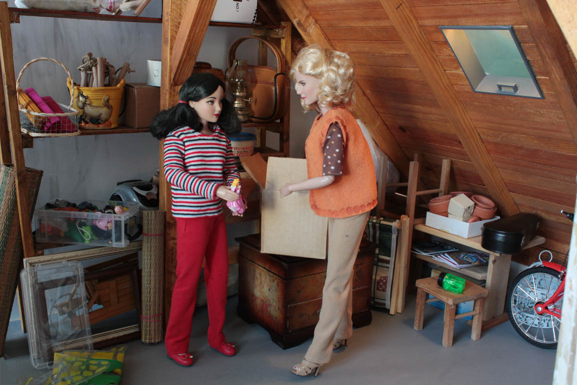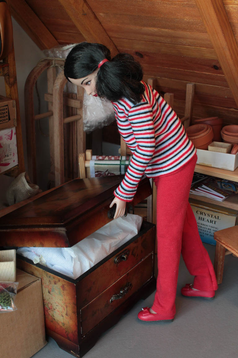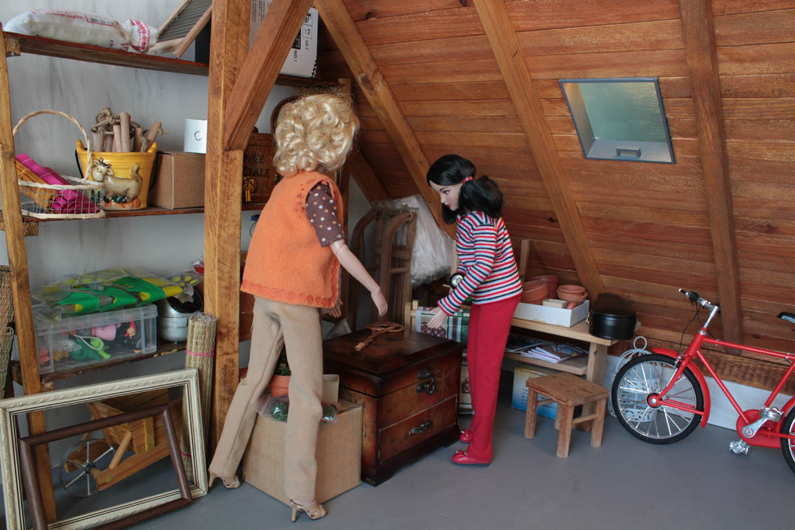 uloženy její dětské hračky...hned vytahuje princeznu, se kterou si jako malá hrávala. Ukazuje jí