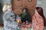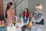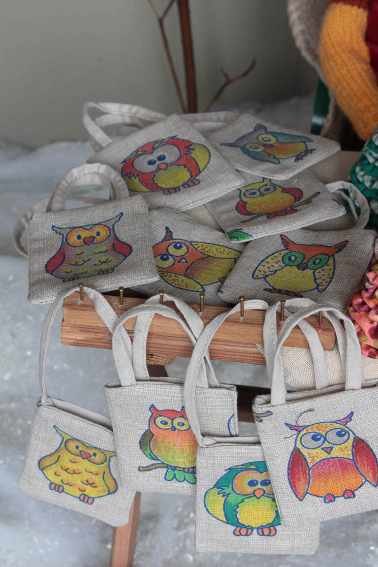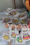 prohlížejí si vystavené věci. Ilonu zaujmou látkové tašky pro malé slečny na