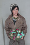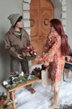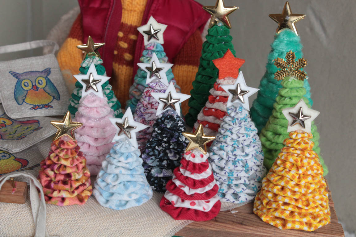 prohlíží látkové vánoční stromečky a přemýšlí, zda nemá jeden vzít jako dekoraci