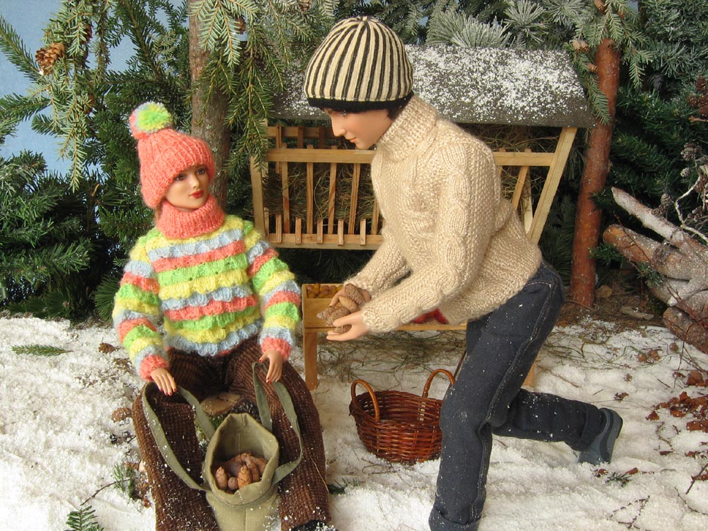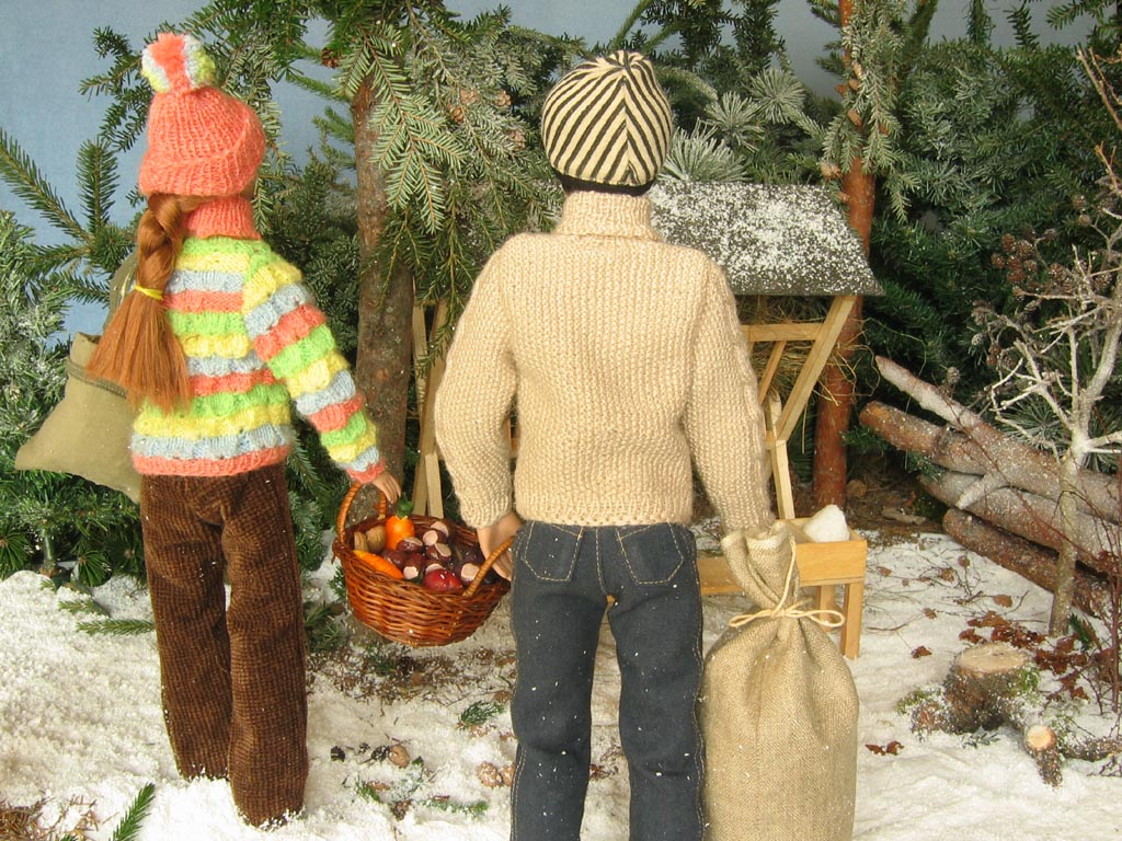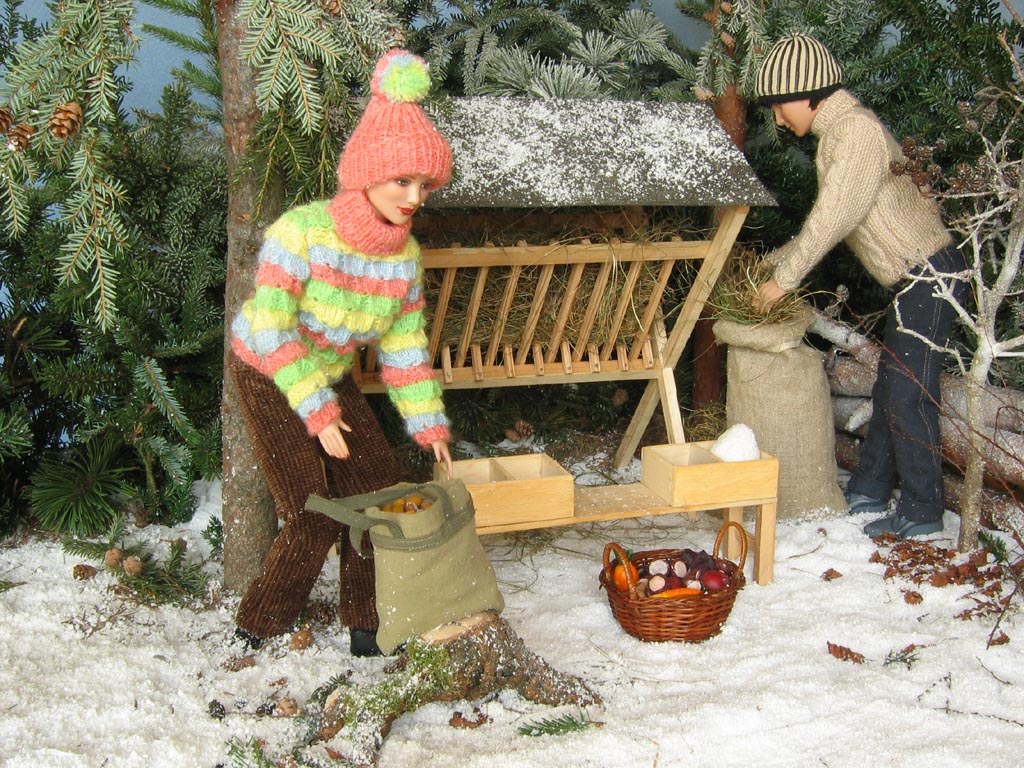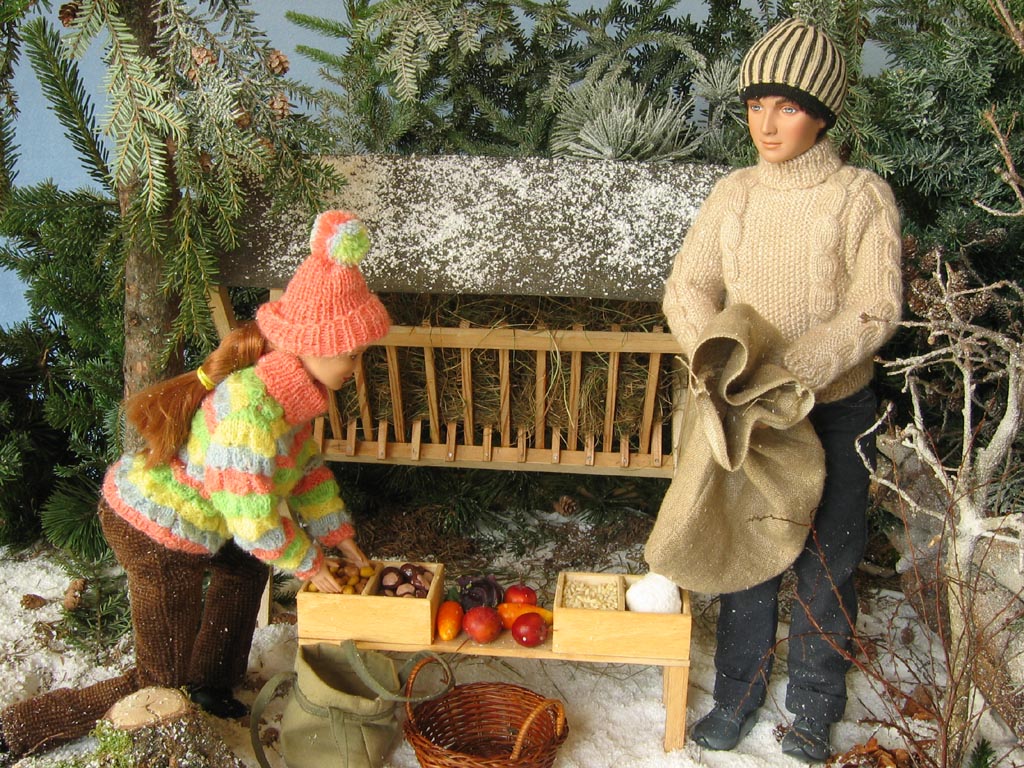 Scéna Krmelec i lavice jsou samozřejmě dřevěné, při jejich výrobě mi obětavě ( navzdory revmatickým kolenům) pomáhal můj taťka…kdyby jen nechtěl všechno dělat tak fortelné, jakoby tyhle miniatury měly vydržet nápor skutečné zvěře! Nicméně, když vyrábím něco stloukaného nebo sešroubovaného (a to se vždy hodí ještě jeden pár šikovných rukou), ochotného spolupracovníka s vzorně vybavenou dílnou nemusím dlouho hledat. Kaštany a žaludy jsou z moduritu, sůl je skutečná stejně jako jablka a pidikedluben. Figurka laně je kupovaná. Panenky Marie :