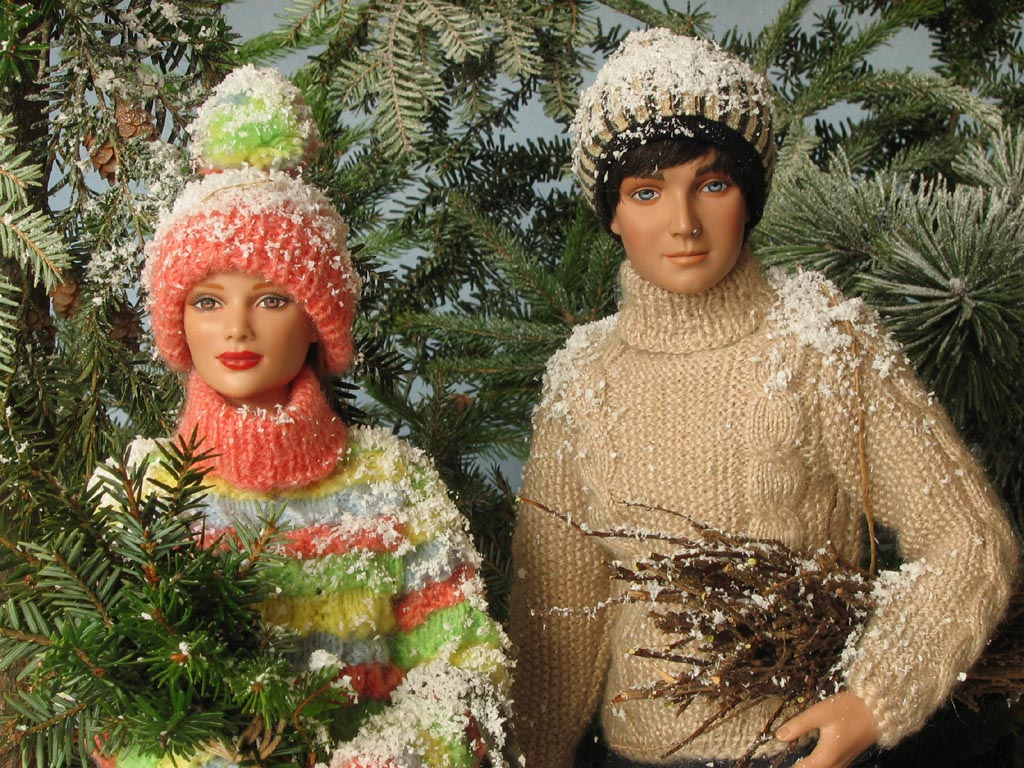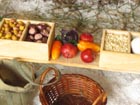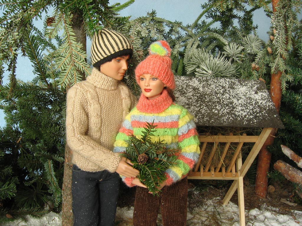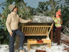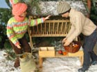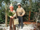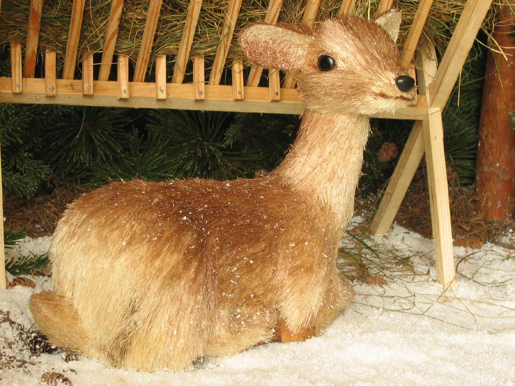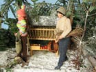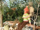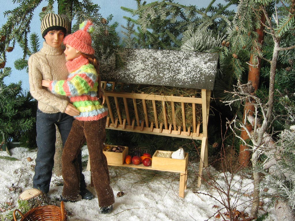 Scéna Krmelec i lavice jsou samozřejmě dřevěné, při jejich výrobě mi obětavě ( navzdory revmatickým kolenům) pomáhal můj taťka…kdyby jen nechtěl všechno dělat tak fortelné, jakoby tyhle miniatury měly vydržet nápor skutečné zvěře! Nicméně, když vyrábím něco stloukaného nebo sešroubovaného (a to se vždy hodí ještě jeden pár šikovných rukou), ochotného spolupracovníka s vzorně vybavenou dílnou nemusím dlouho hledat. Kaštany a žaludy jsou z moduritu, sůl je skutečná stejně jako jablka a pidikedluben. Figurka laně je kupovaná. Panenky Marie :