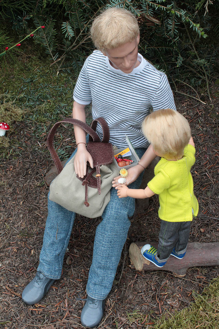 Tatínek Filip dostal nové tričko, zbytek oblečení i batoh jsou z fundusu.