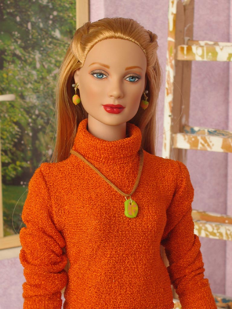 má na sobě oranžový svetřík ušitý z úpletoviny a rovnou světle hnědou sukni. Botičky, které má na nohou už