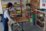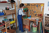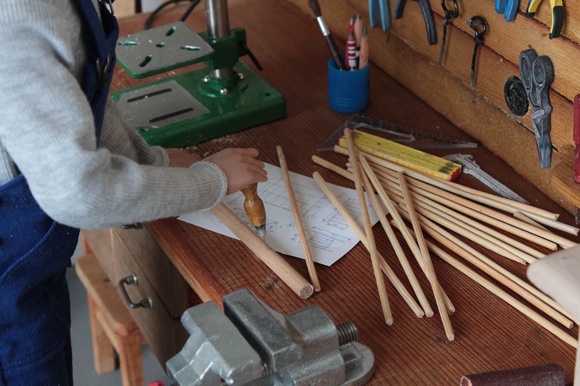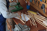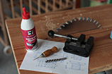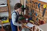 stojanová vrtačka, malý svěrák, lepidlo na dřevo a šídlo.