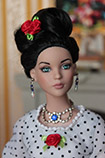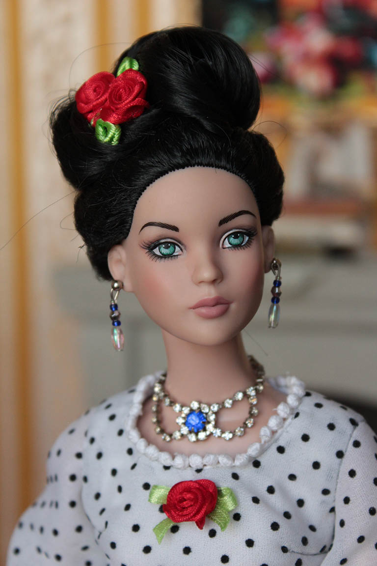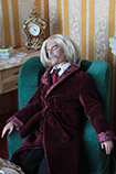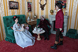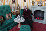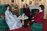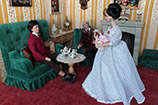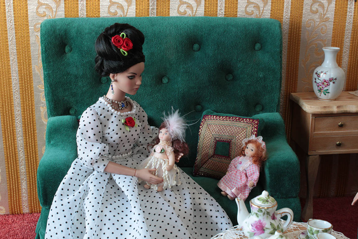 pokoje, kde sedí na pohovce mladá dívka se svými panenkami, ve velkém