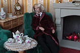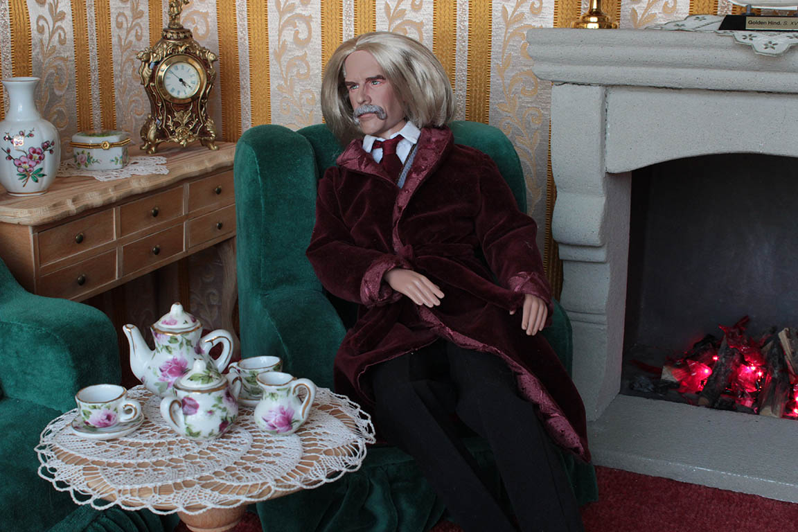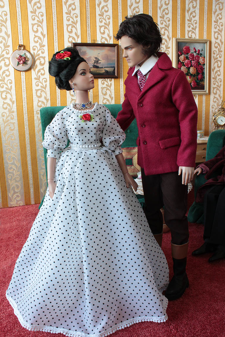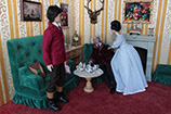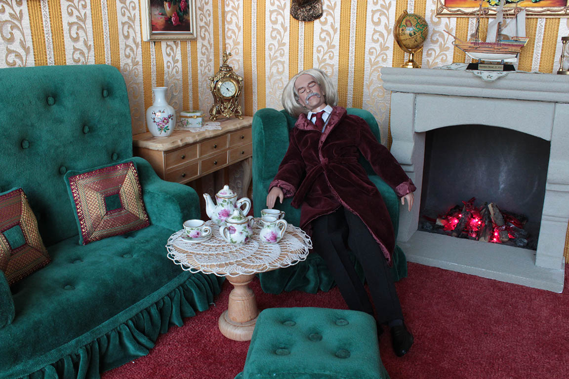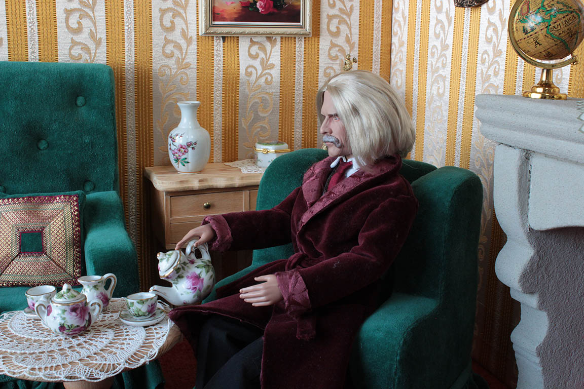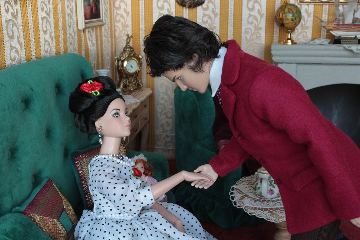 Chvatně odklidí své panenky a pozve Tomáše na čaj, který je nachystaný v