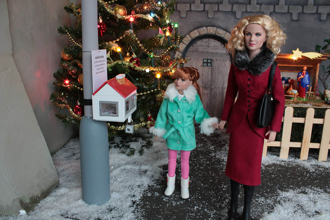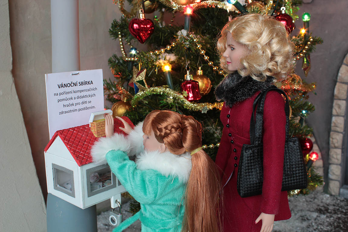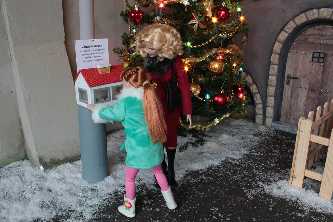 za stromečkem, ale pak si vzpomene na kasičku připevněnou na sloupu s