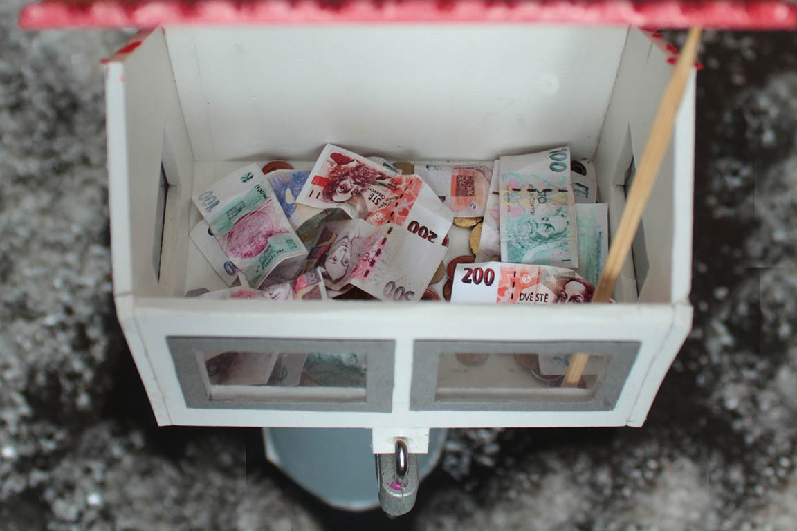 pár drobných a těší se, jak okýnky uvidí propadnout peníze dovnitř. Obě