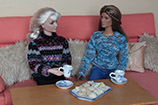pikantní topinky a pivo, děvčata si vychutnávají kávu a pár koláčů, které jim po