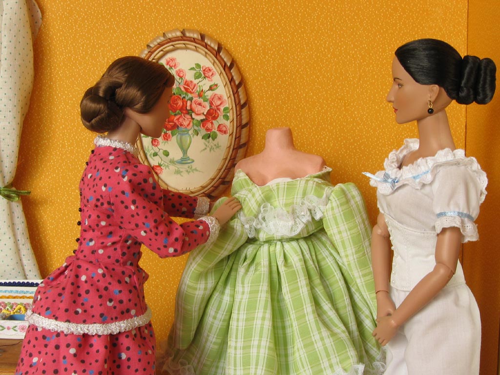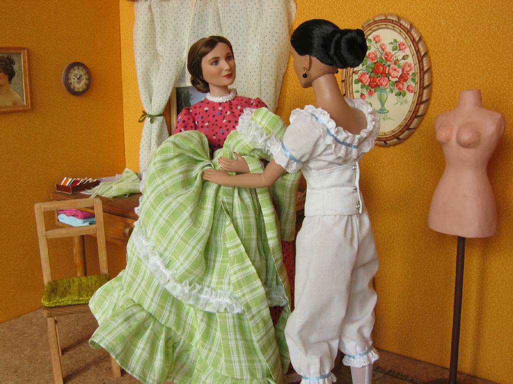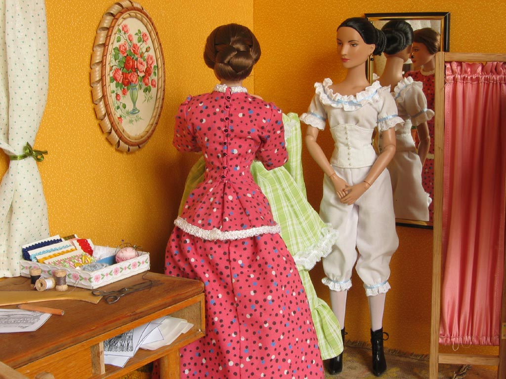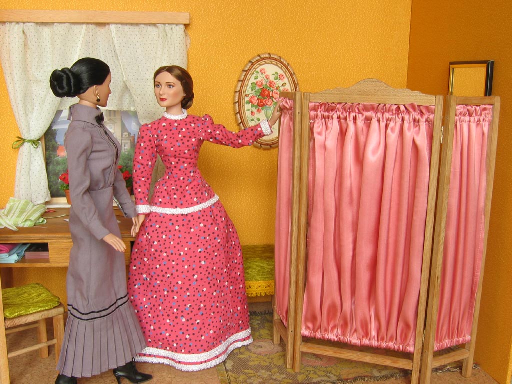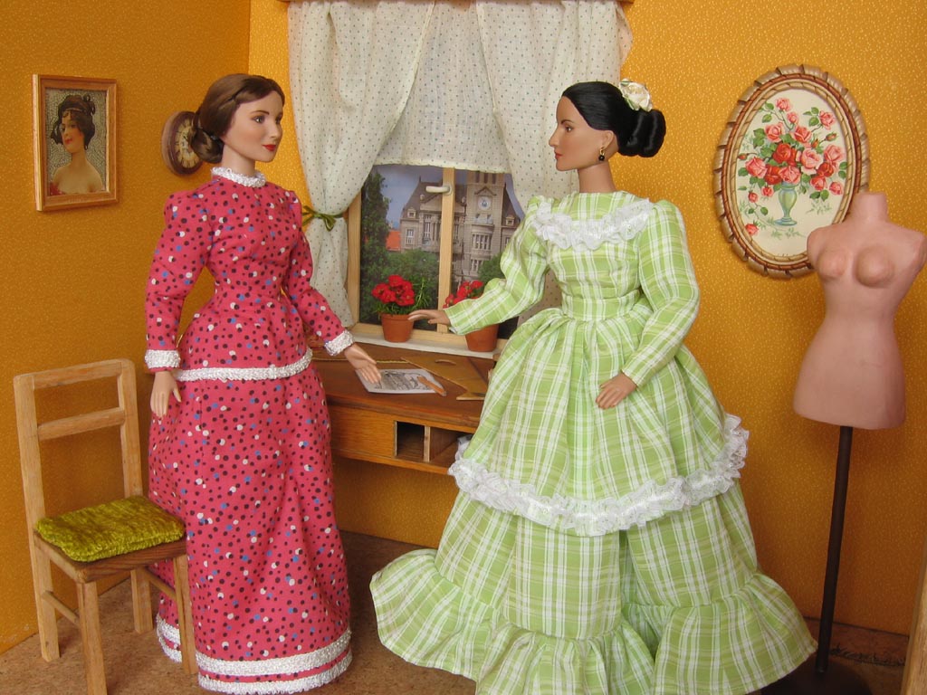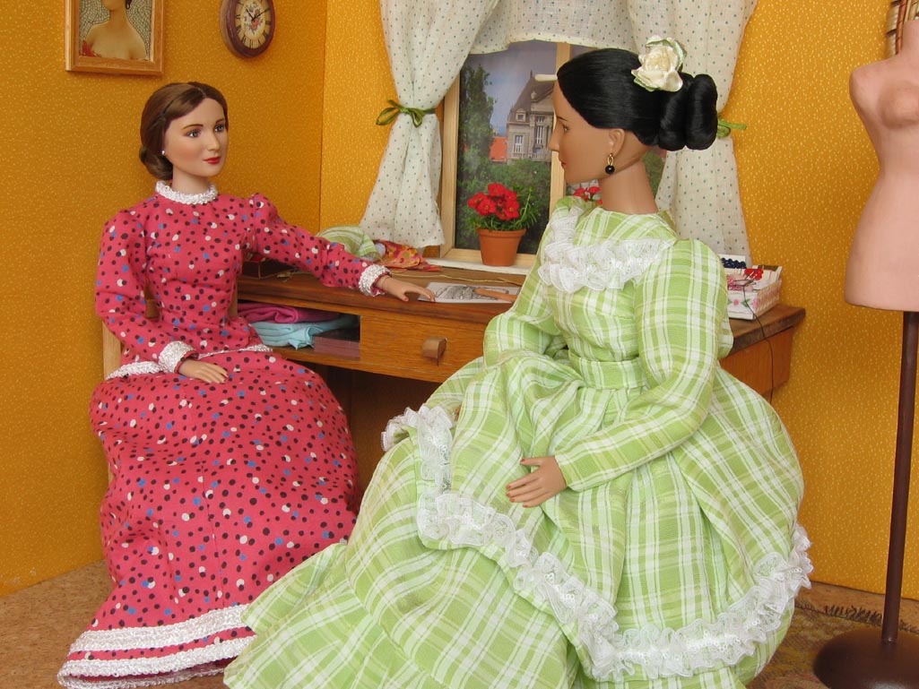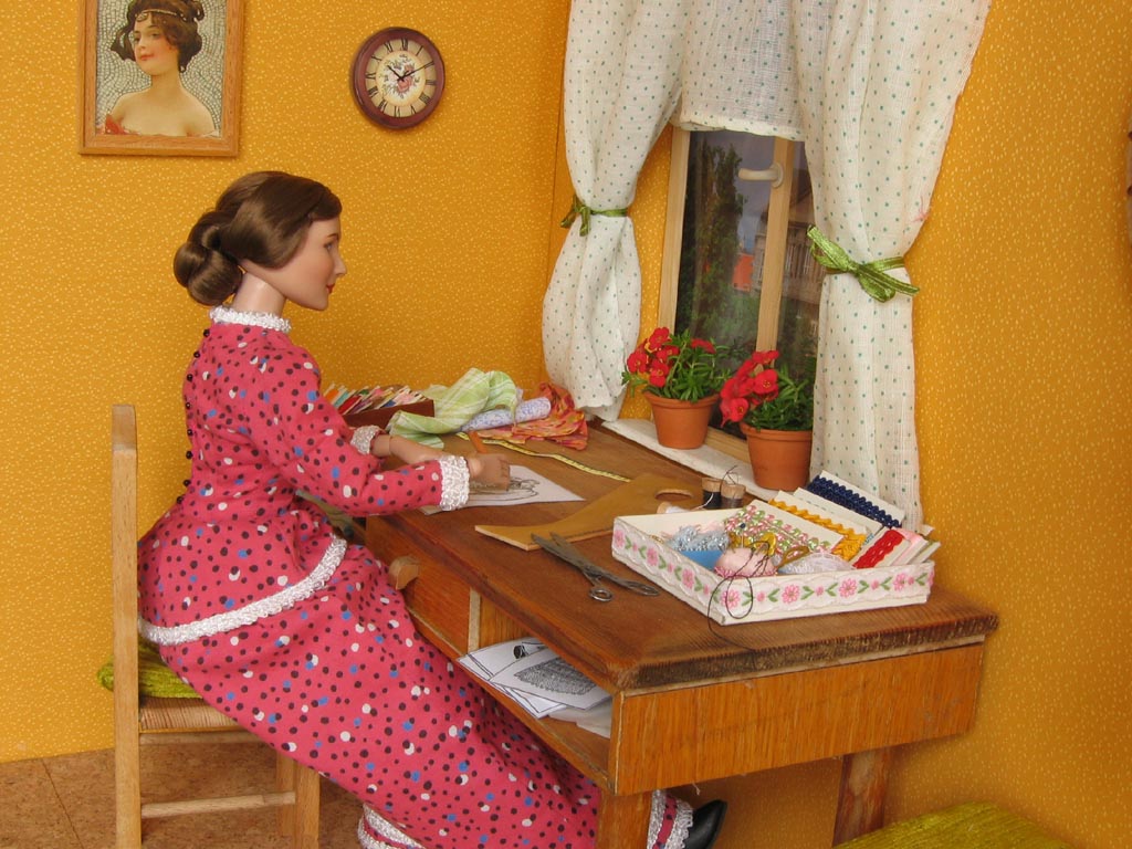 obrázky na stěnách jsou ze starých pohlednic. Na stole má švadlena krejčovské