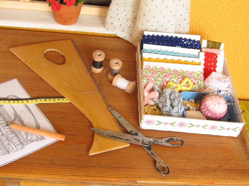 pravítko, velké nůžky (vyráběl tatínek), špulky s nitěmi, různé prýmky, knoflíčky a