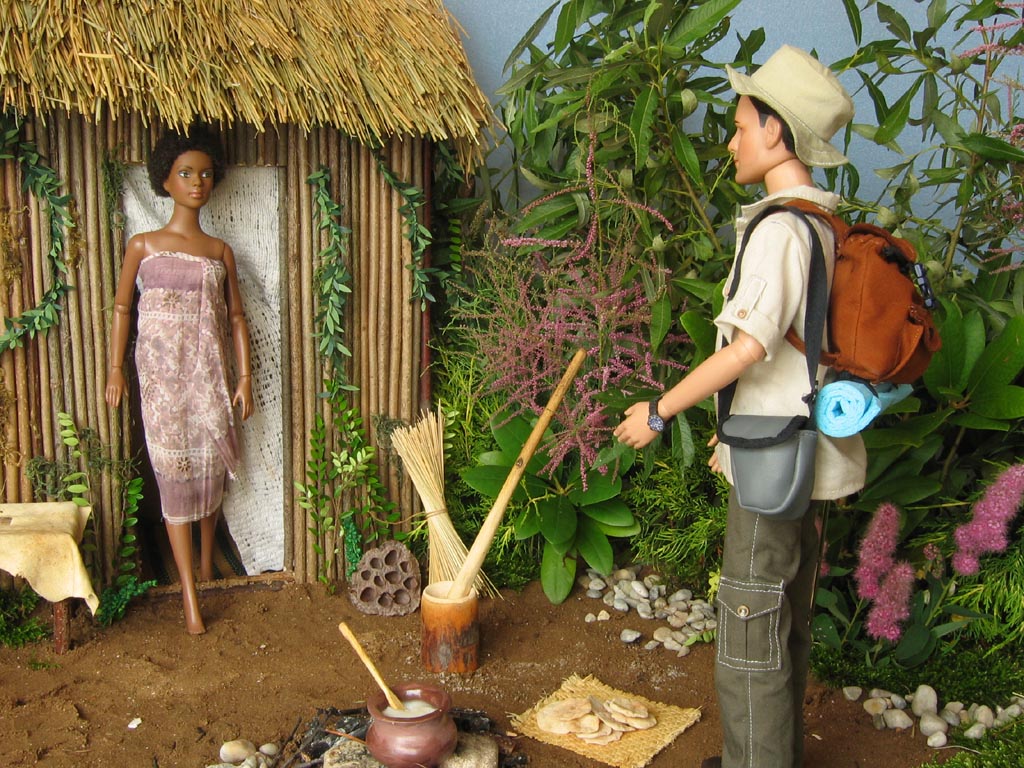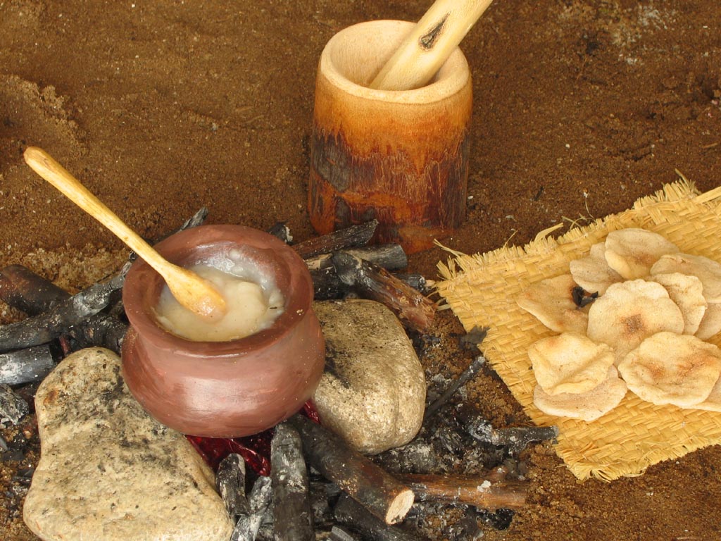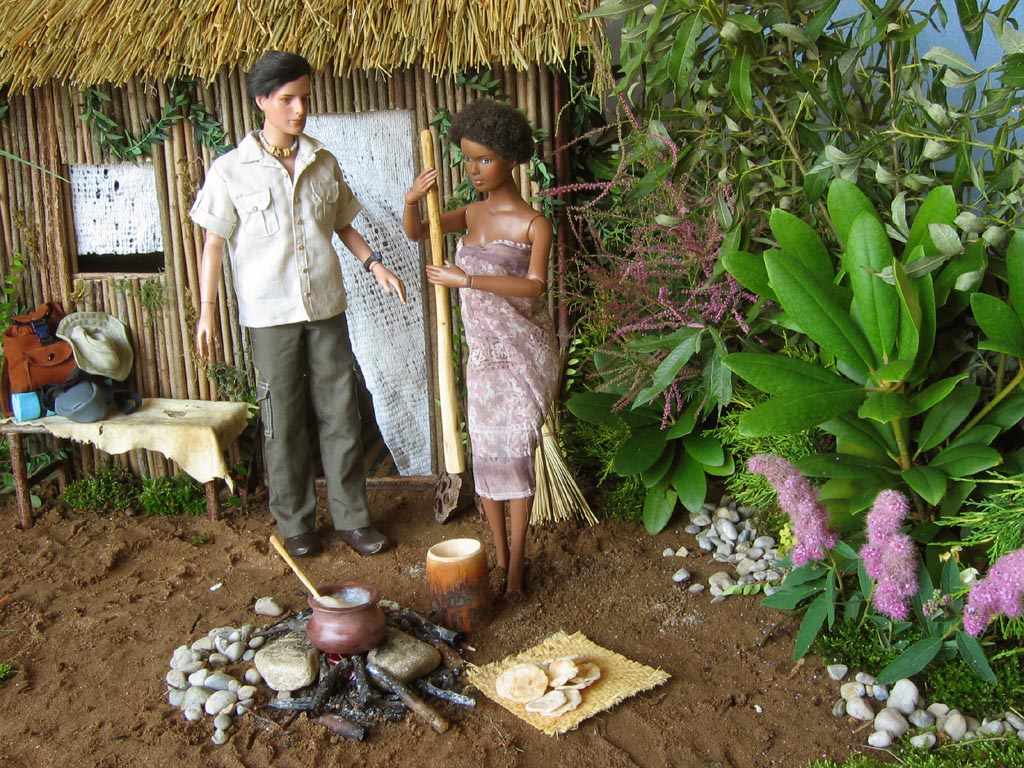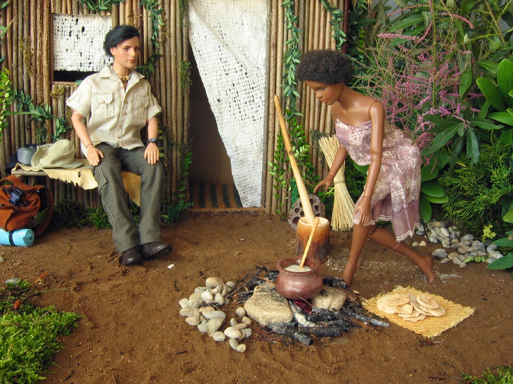 obtížné". Vyrobit ohniště bylo samozřejmě velice snadné, kotlík je ze samotvrdnoucí hmoty a je v něm skutečná kaše, nádoba na drcení i tlouk jsou ze