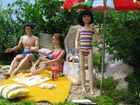 vodě ušila lehké plátěné šaty na ramínka, plavky si vypůjčila od Barunky a sandálky měla od maminky