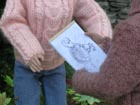 Růžový svetr s copánkovým vzorem je upletený ze směsové příze (acryl + angora),