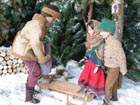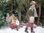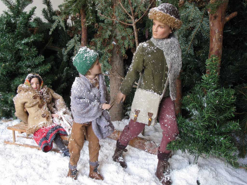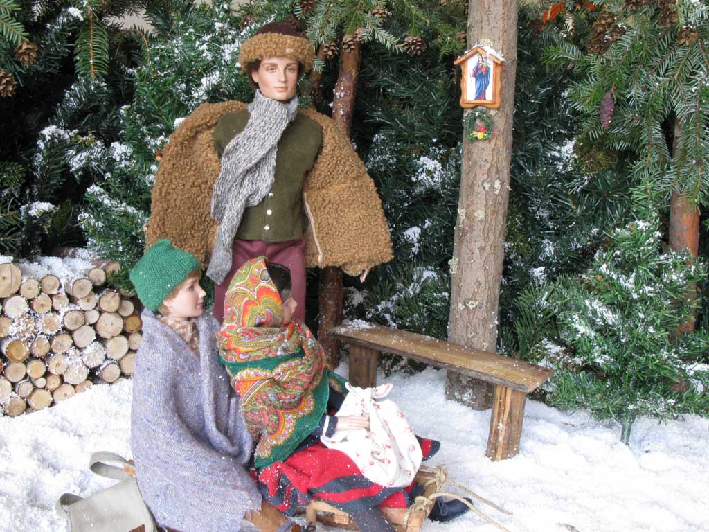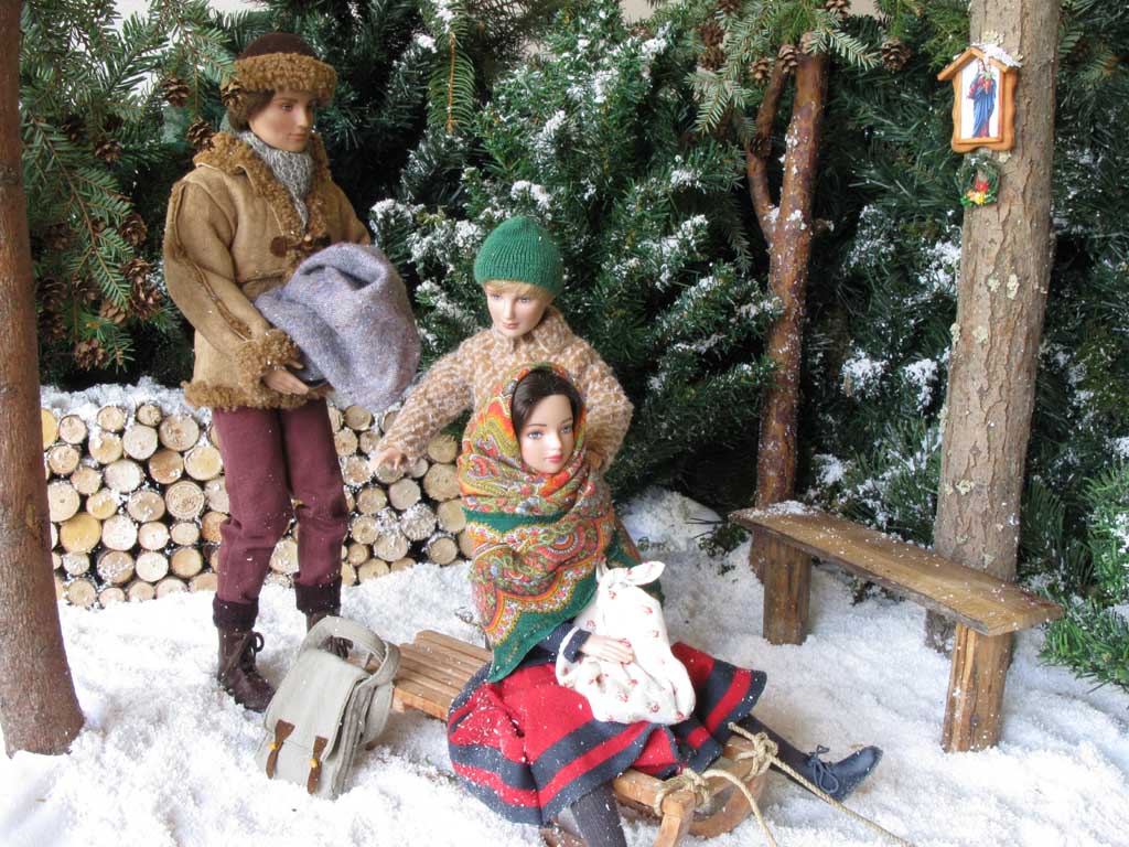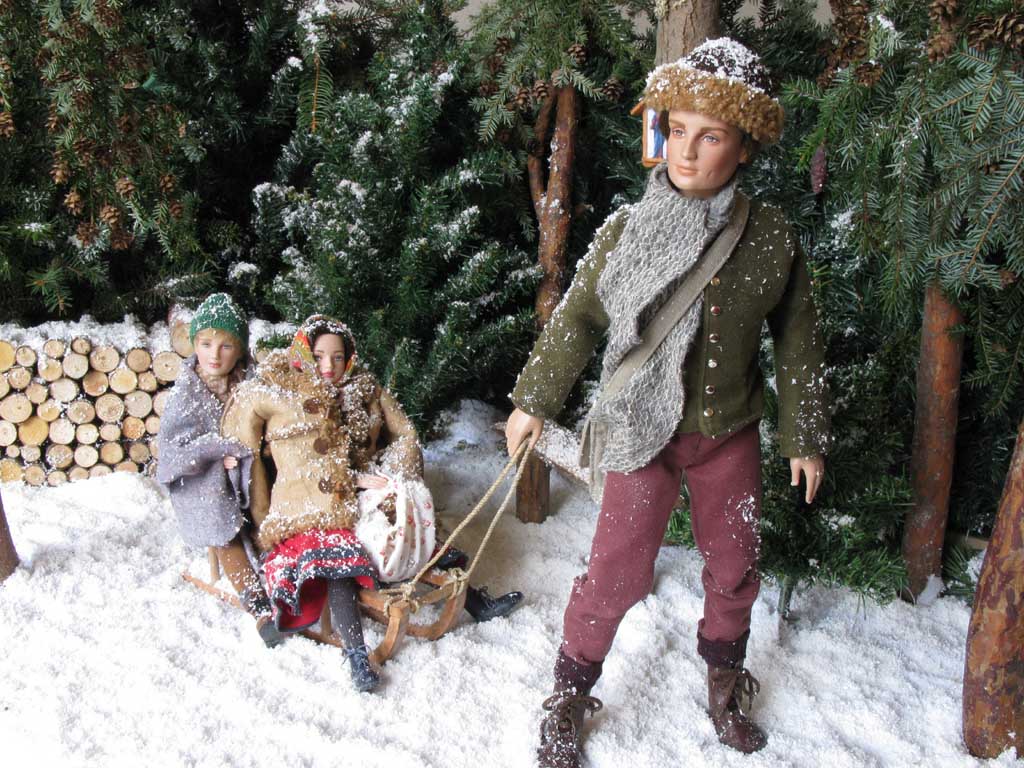 obrázek s věnečkem, lavička i hranice dříví jsou z fundusu. Hlavní věc - sáňky -