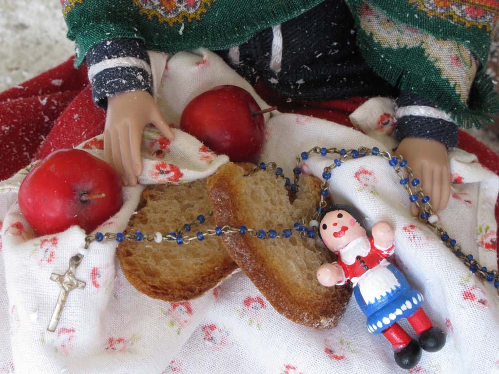 zabalila kousky tvrdého chleba, jablíčka, která drží od podzimu v lednici jako