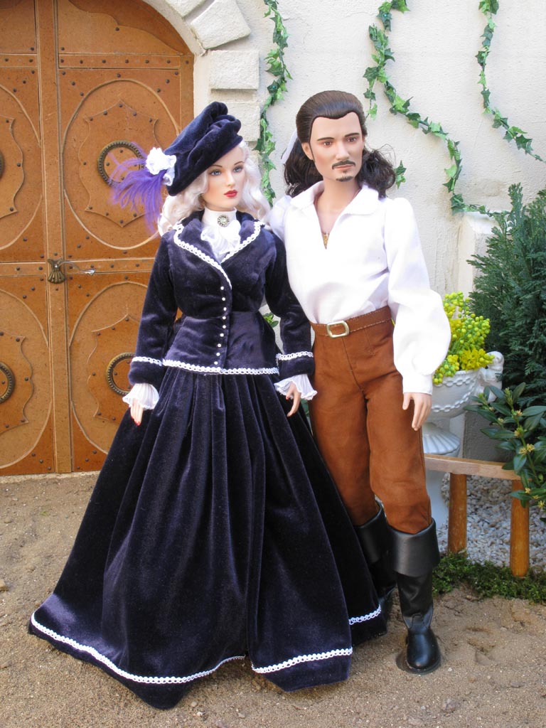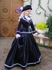 a kabátek jsou z modrofialového sametu zdobené úzkým bílým prýmkem. Halenka z