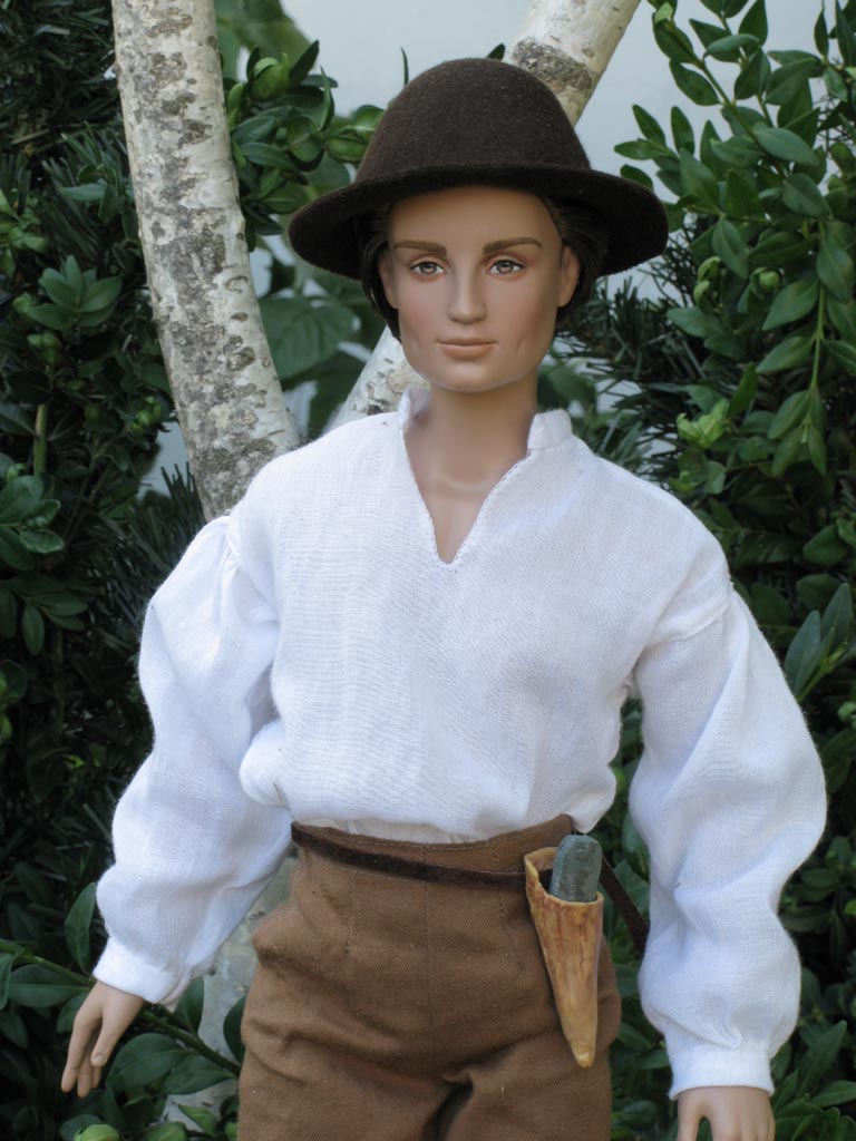 ušitá z bílého batistu. Hnědé kalhoty jsou z pánských plátěných kalhot a mají