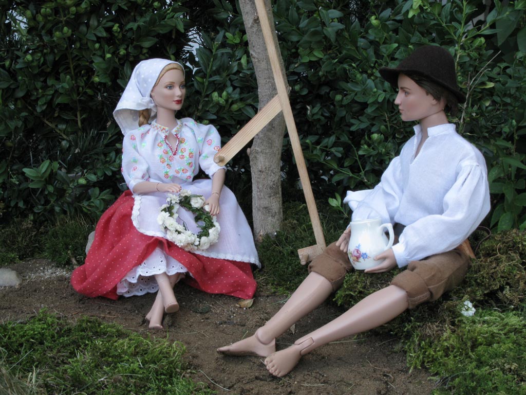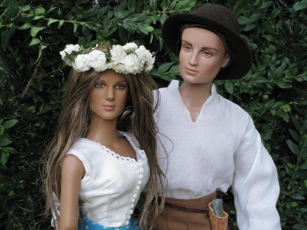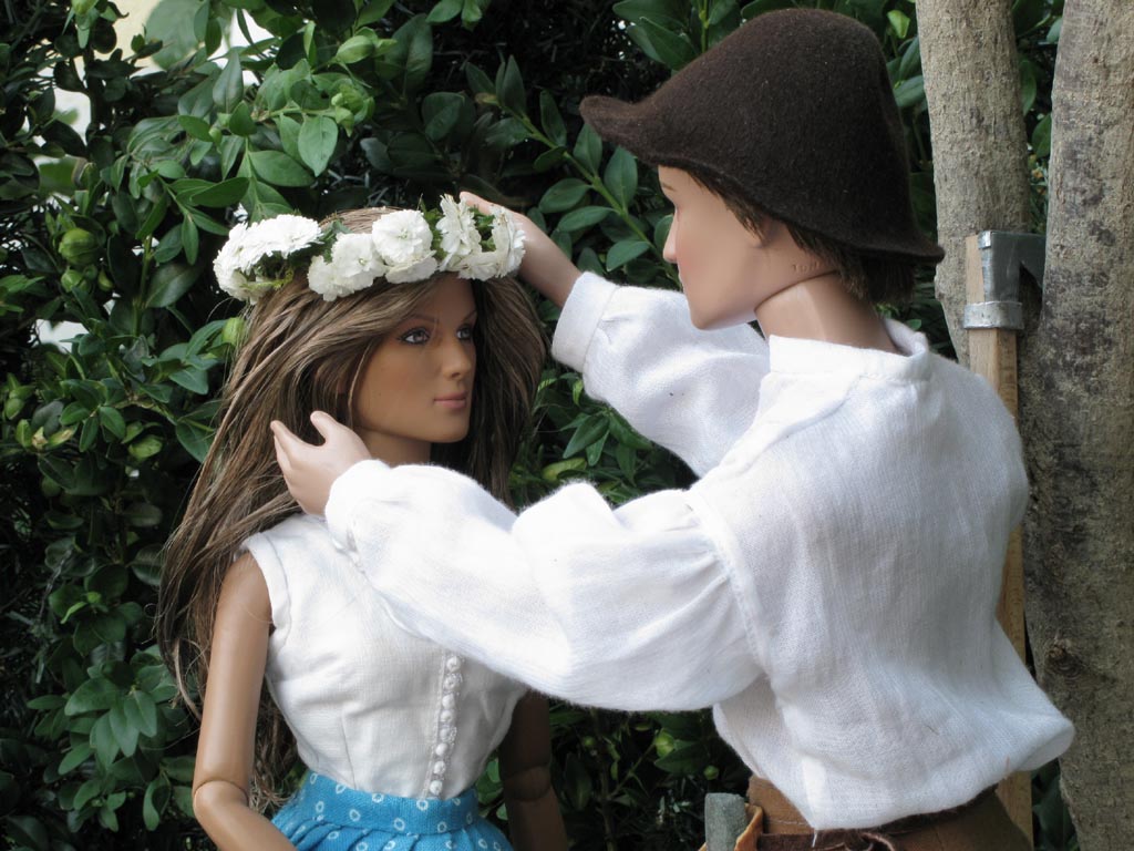 Sbírá ze země věneček, který upustila Verunka a vkládá jej do vlasů té, která mu