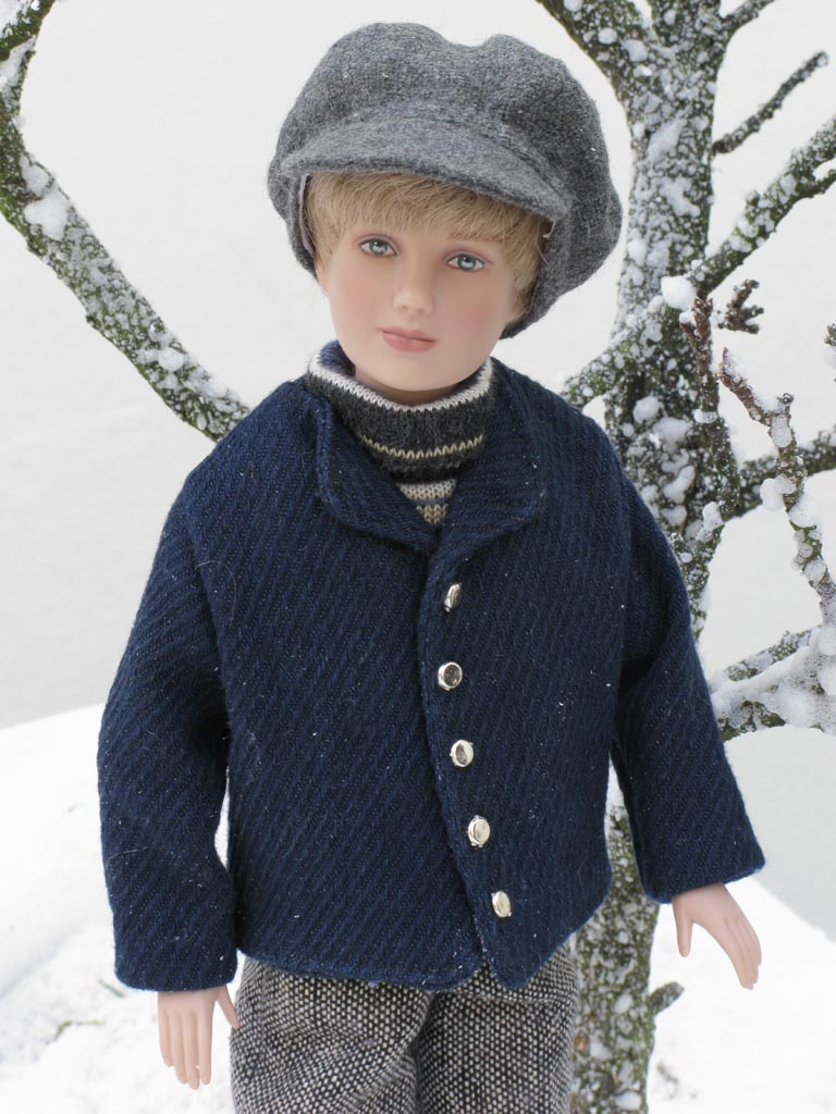 z tuhé tmavomodré látky ušila kabátek s dragounem a nalepenými knoflíky.