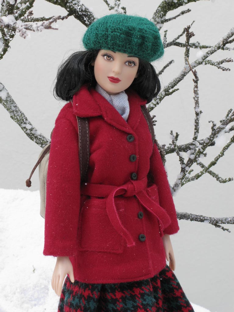 Vendulka má sukni ze silnější vlněné látky, kabátek je z tenkého flauše, baret