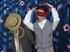 Rudolf se zavázanýma očima. Publikum ani nedýchá. Valerie stojí nehnutě, plně
