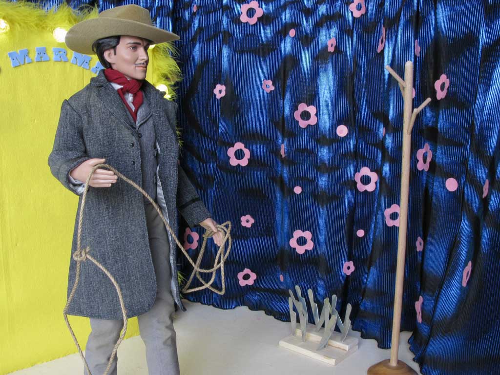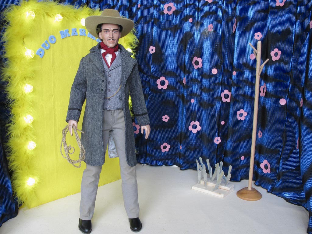 Rudolf přichází na pódium v kovbojském oblečení, v ruce drží laso. Do