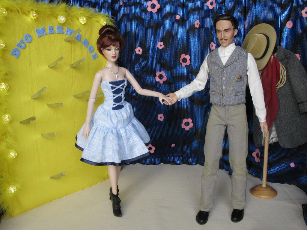 látky. Na krku má zavěšený miniaturní křížek s kamínky, šněrovací botičky jsou