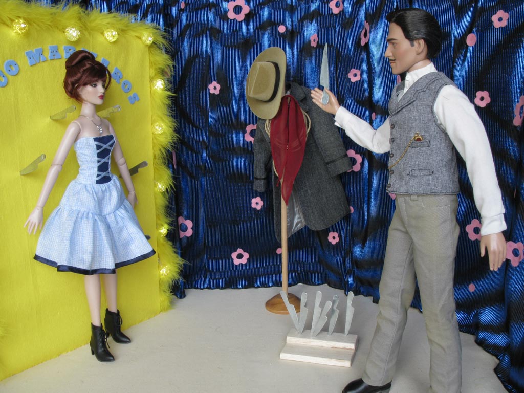 do rukou první z nožů zabodnutých v dřevěné desce. Strefuje se těsně vedle