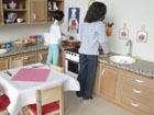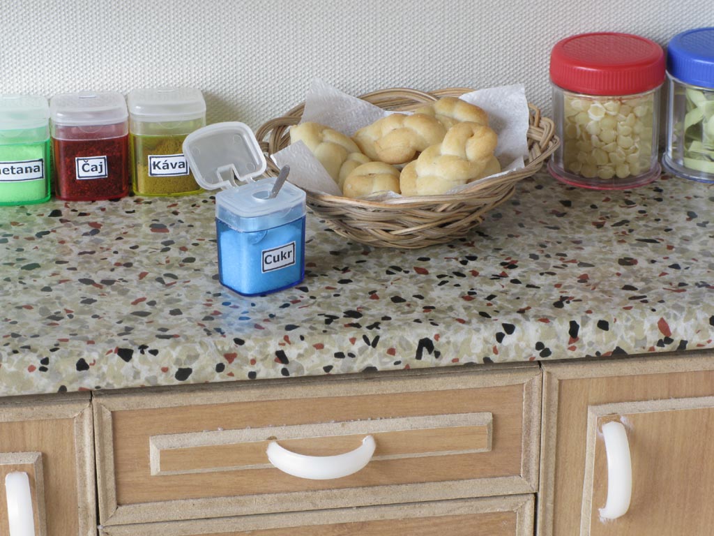 část. Pracovní deska je tentokrát potažená samolepící tapetou. Z malé plastové misky vhodného tvaru vznikl dřez,