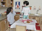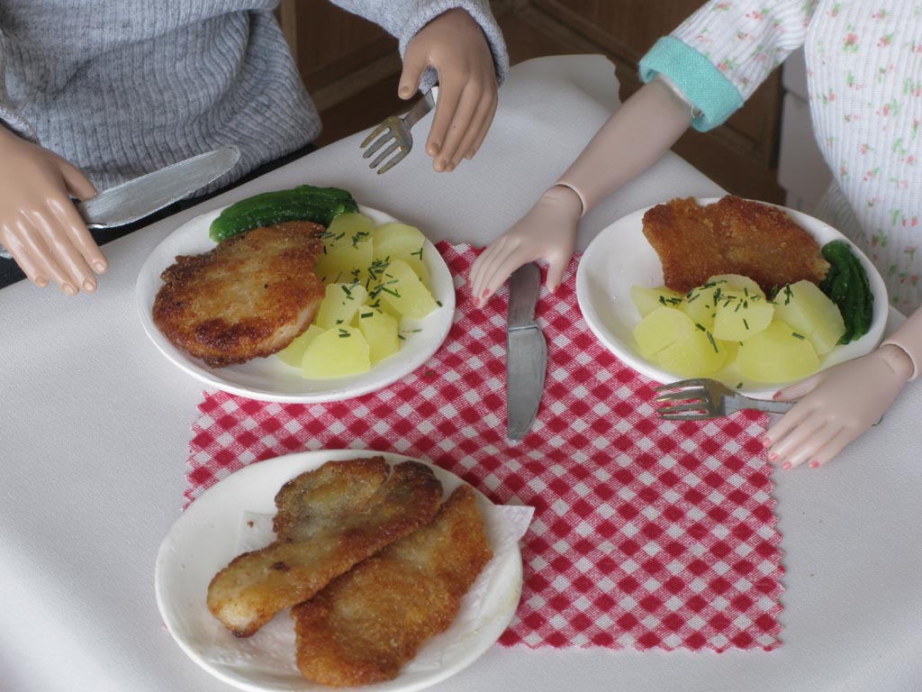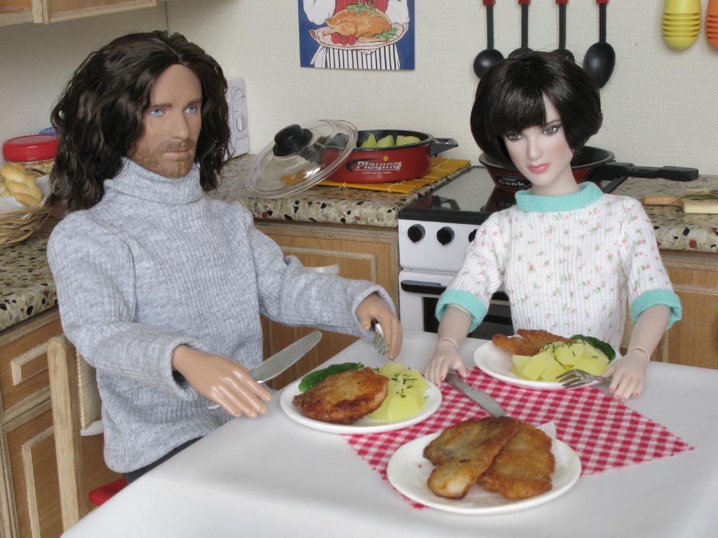 jde nakrájet pažitku na brambory. Potom už oba usednou ke stolu, jídla je dost a Šimon se nenechává dvakrát
