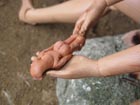 Divočák z hlíny ženskou postavu. Ostatní pokukují a obdivují jeho zručnost.