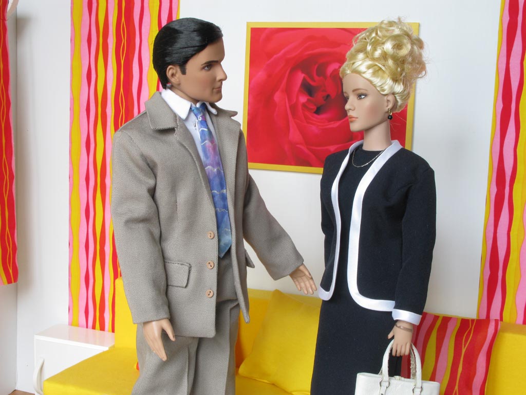 bez rukávů a kabátku lemovaného bílým saténovým proužkem.