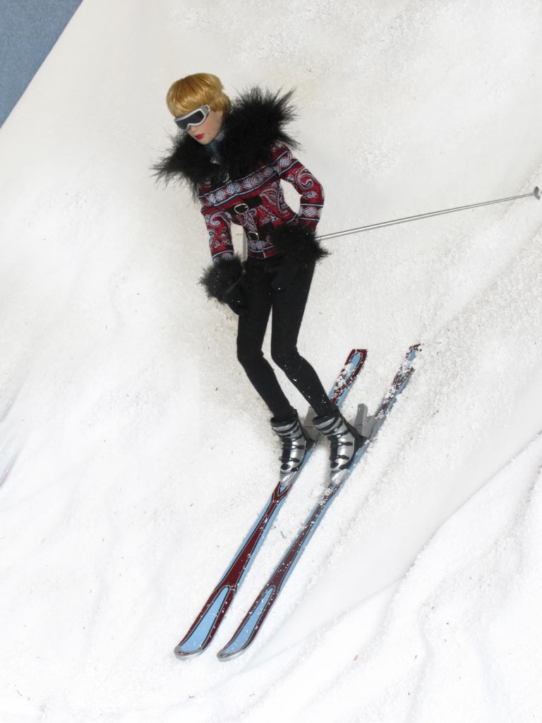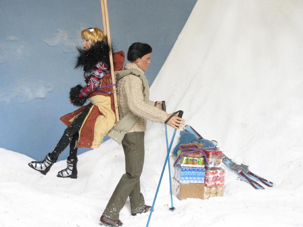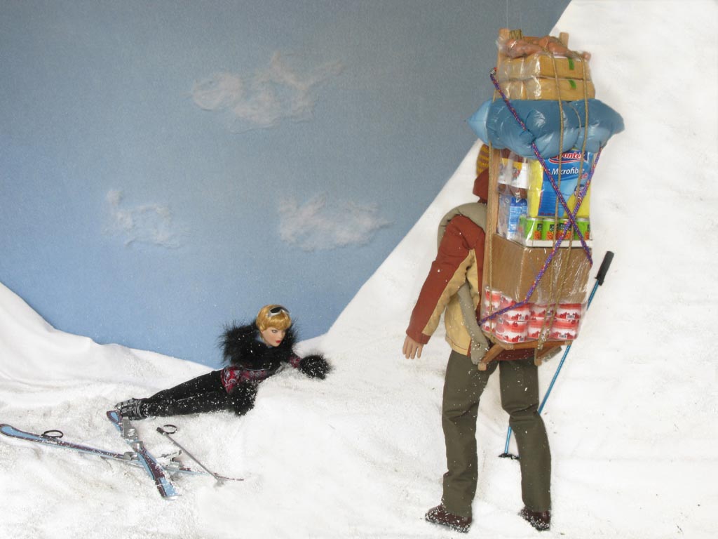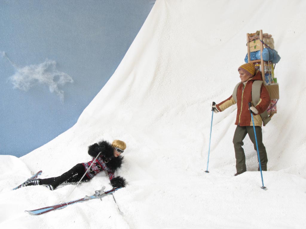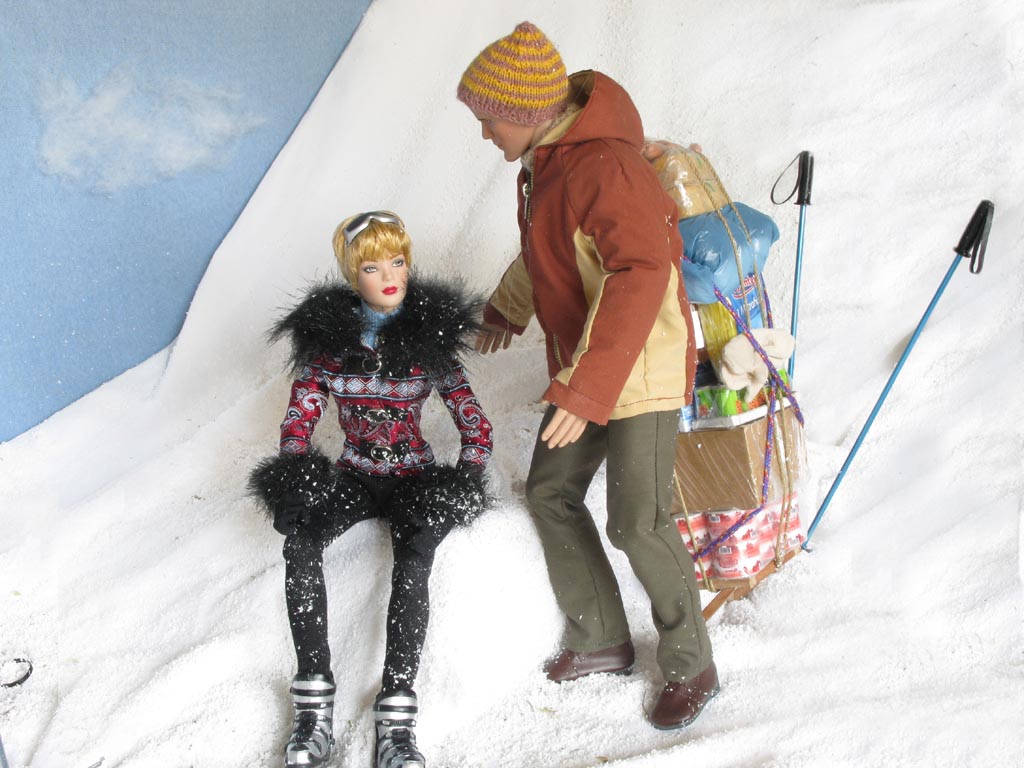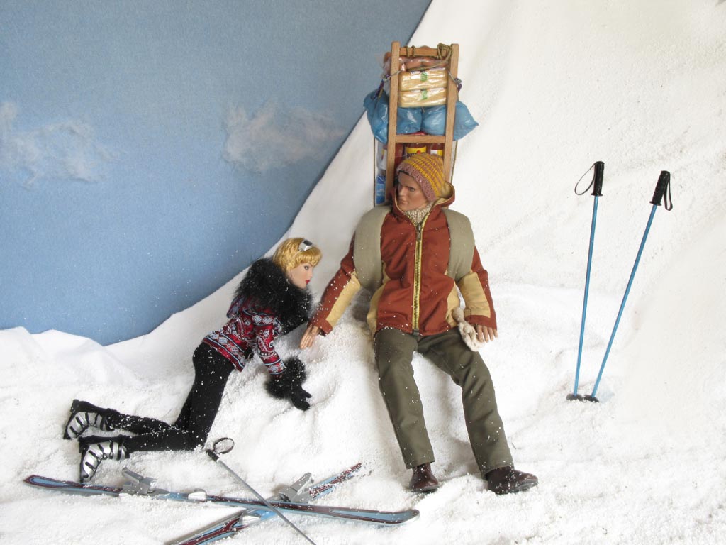 sněhu ležící postavu. Přichází blíž a vidí mladou lyžařku, zjevně otřesenou po